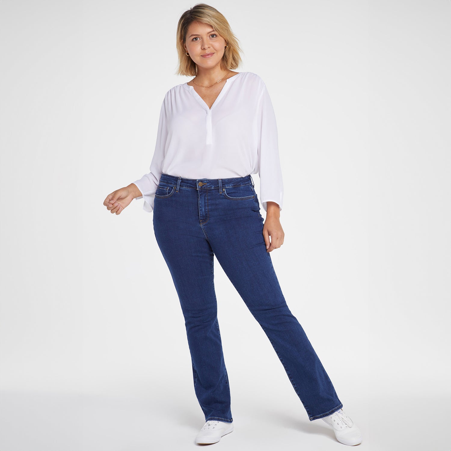 Not too long, not too short—NYDJ's Barbara Bootcut Jeans in Plus Size fit just right. Our exclusive Lift Tuck® Technology uses a proprietary slimming panel with a patented criss-cross design to give this comfortable, go-to style its superior shaping powers. The traditional bootcut fit gives you a flattering legs-for-days look—and makes these jeans an effortless closet staple. Finished with classic five-pocket styling, zip fly and button closure.
