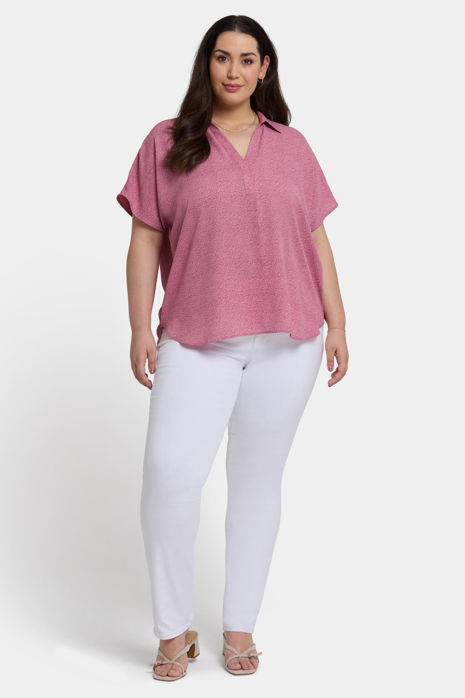 NYDJ's Becky Short Sleeved Blouse in Plus Size is crafted from lightweight georgette in a loose silhouette that feels casual yet polished. This collared pullover style is a true wardrobe essential with fine tailored details and clean-finished with a curved hem. Features a split neckline and short dolman sleeves. This blouse is made with a sustainable polyester fiber created from 100% post-consumer plastic waste, resulting in less water and energy use and fewer greenhouse gas emissions without changing the look and feel of the fabric.