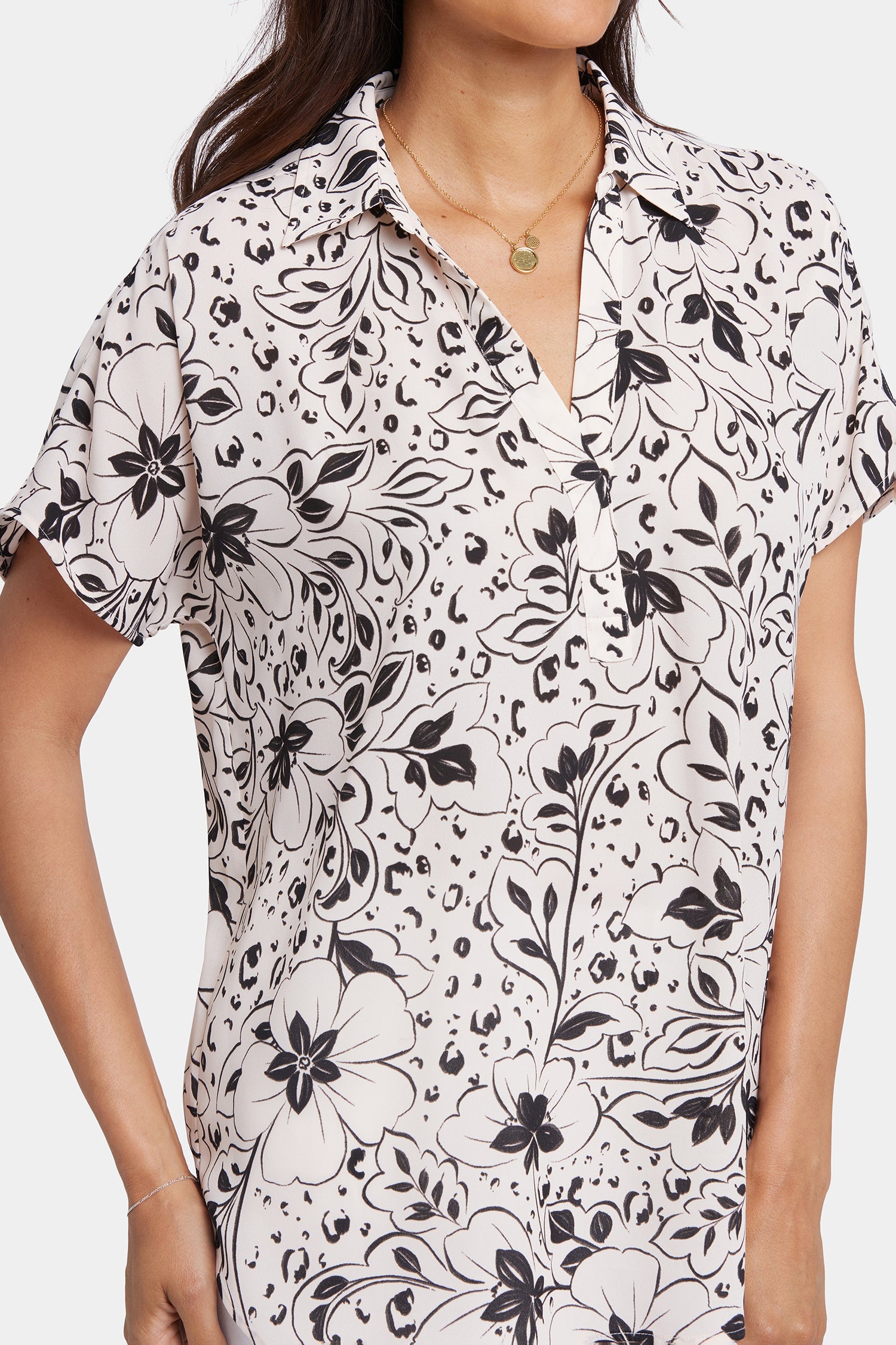 NYDJ's Becky Short Sleeved Blouse is crafted from lightweight georgette in a loose silhouette that feels casual yet polished. This collared pullover style is a true wardrobe essential with fine tailored details and clean-finished with a curved hem. Features a split neckline and short dolman sleeves. This blouse is made with a sustainable polyester fiber created from 100% post-consumer plastic waste, resulting in less water and energy use and fewer greenhouse gas emissions without changing the look and feel of the fabric.