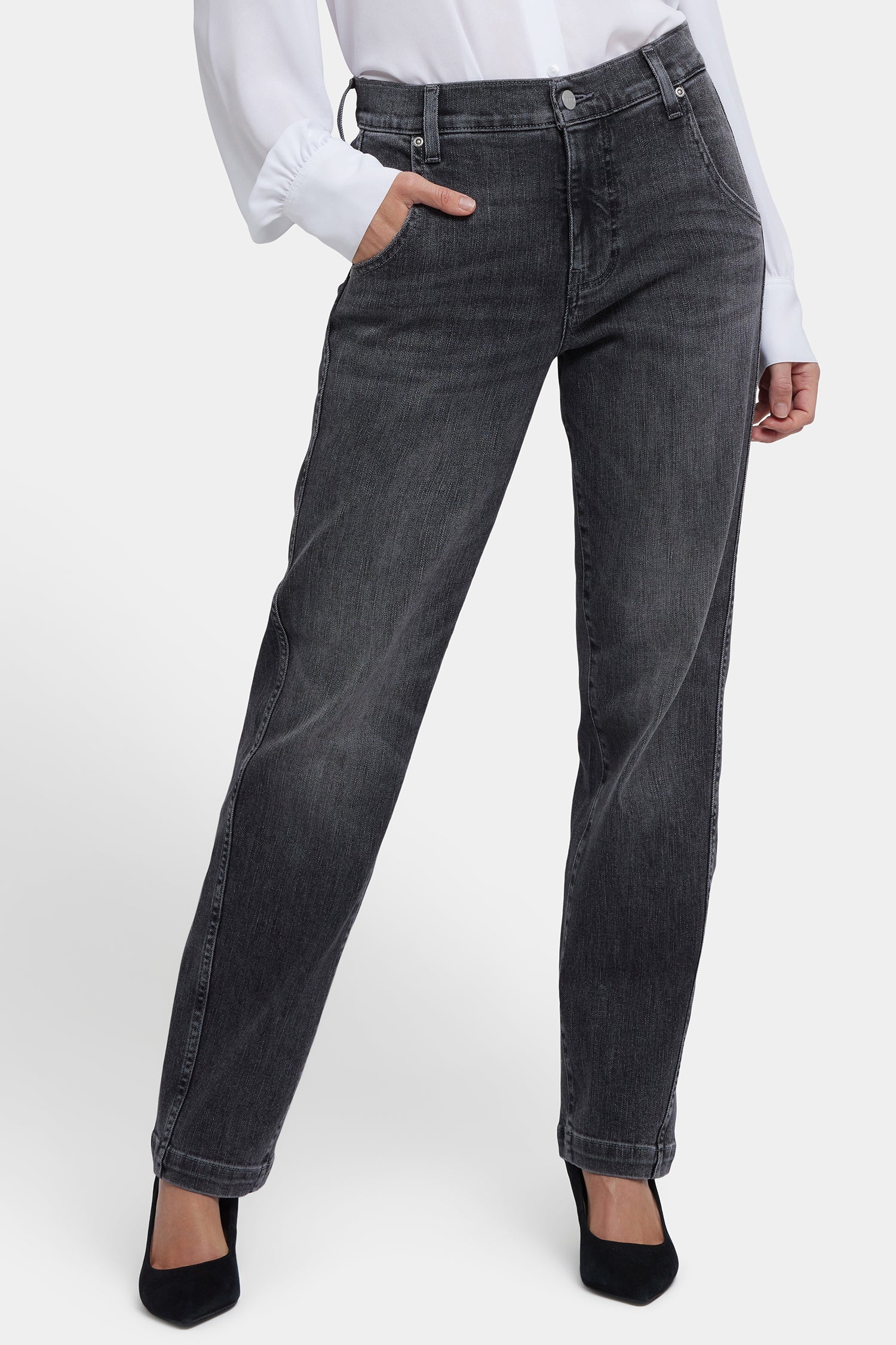 NYDJ's Brooke Loose Straight Jeans in Petite will make you look as good as you feel. This vintage-inspired jean features a relaxed straight fit through the legs and a curve-flattering high rise. Finished with four-pocket styling, zip fly and button closure. Vintage Noir is a medium grey wash with a warm tint as well as whiskering and fading throughout. This jean is made with earth-friendly methods that result in reduced consumption of water, chemicals and/or energy.