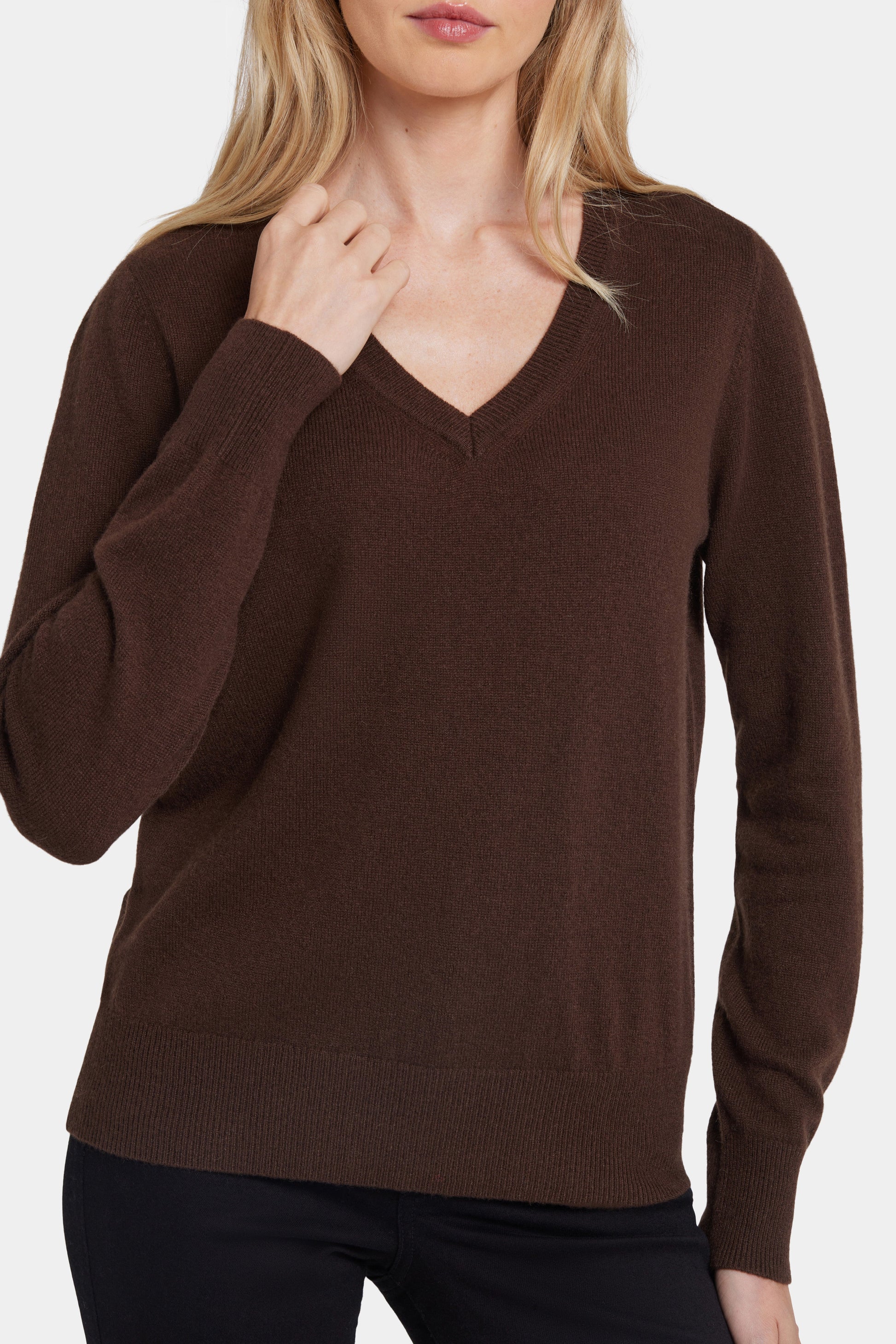 NYDJ's Cashmere Classic V-Neck Sweater offers timeless and chic style that easily complements any outfit. Featuring ribbed trim and a snug fit, this pullover sweater is versatile and essential for your wardrobe.