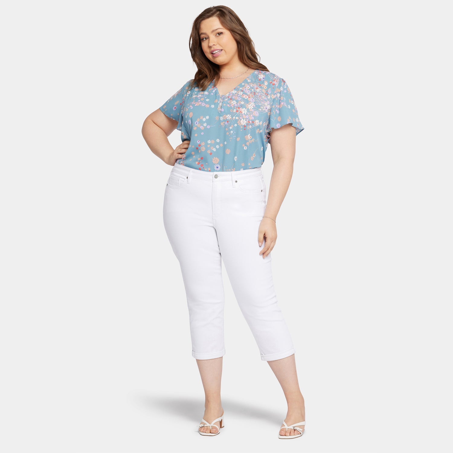 With a cool capri length and flattering slim fit, NYDJ's Chloe Skinny Capri Jeans in Plus Size in Cool Embrace® Denim are definitely on your must-wear list for spring and summer. Cool Embrace® Denim makes rising temperatures a breeze by using best-of-its-kind, moisture-wicking technology to keep you cool and comfortable. Our Lift Tuck® Technology uses a proprietary slimming panel with a patented criss-cross design to shape and support your curves. Finished with five-pocket styling, zip fly, button waist and roll cuffs.