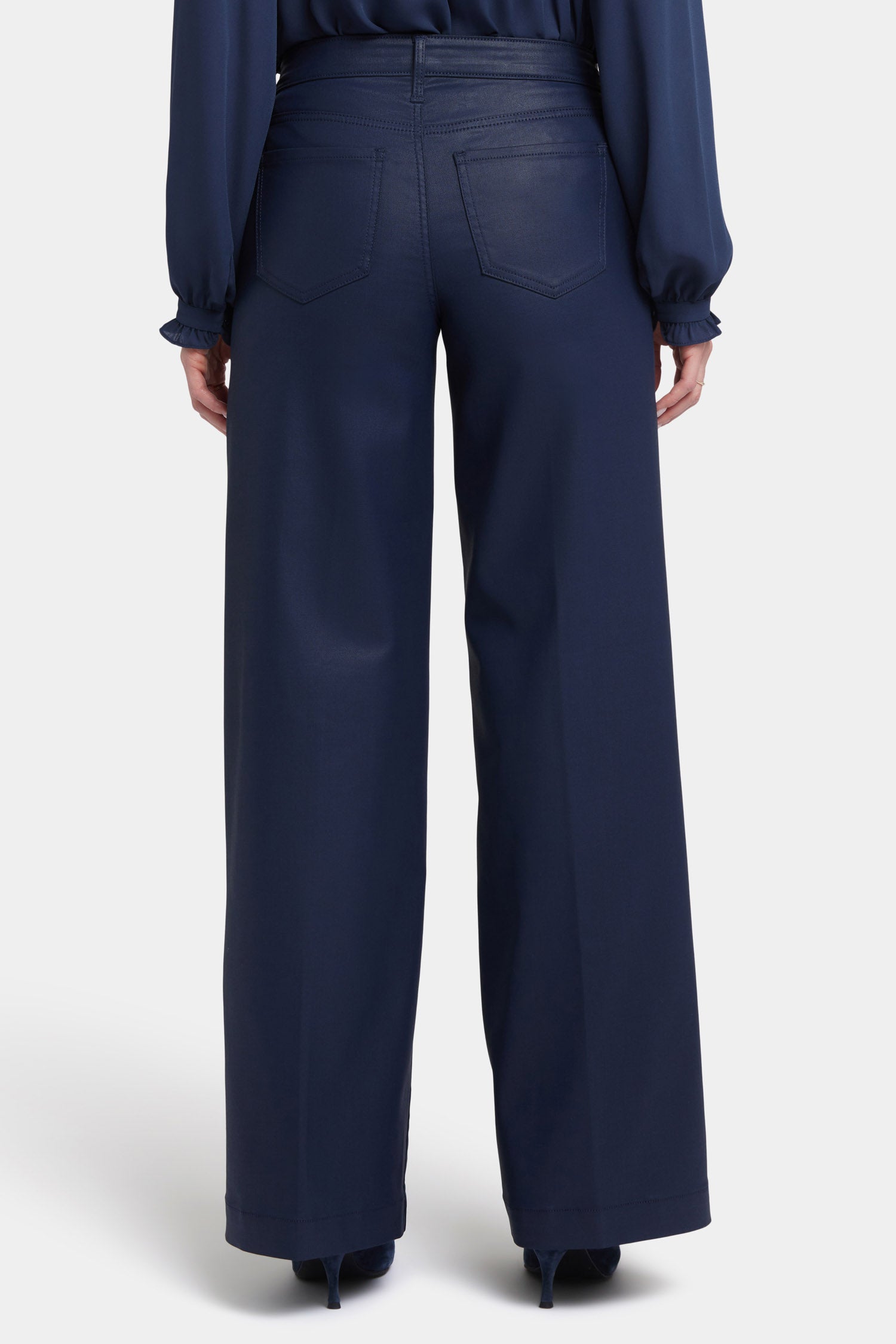 The Coated Teresa Wide Leg Jeans by NYDJ cinch your waist, enhancing your natural silhouette. Their wide legs add instant polish to everything you pair them with, and they have a coated finish that gives them a sleek, sophisticated appearance. Our Lift Tuck® Technology is made to help you keep your shape, with a proprietary slimming panel with a patented criss-cross design that smooths and sculpts. Features five-pocket styling, a zip fly with button closure and deep trouser-style hems.
