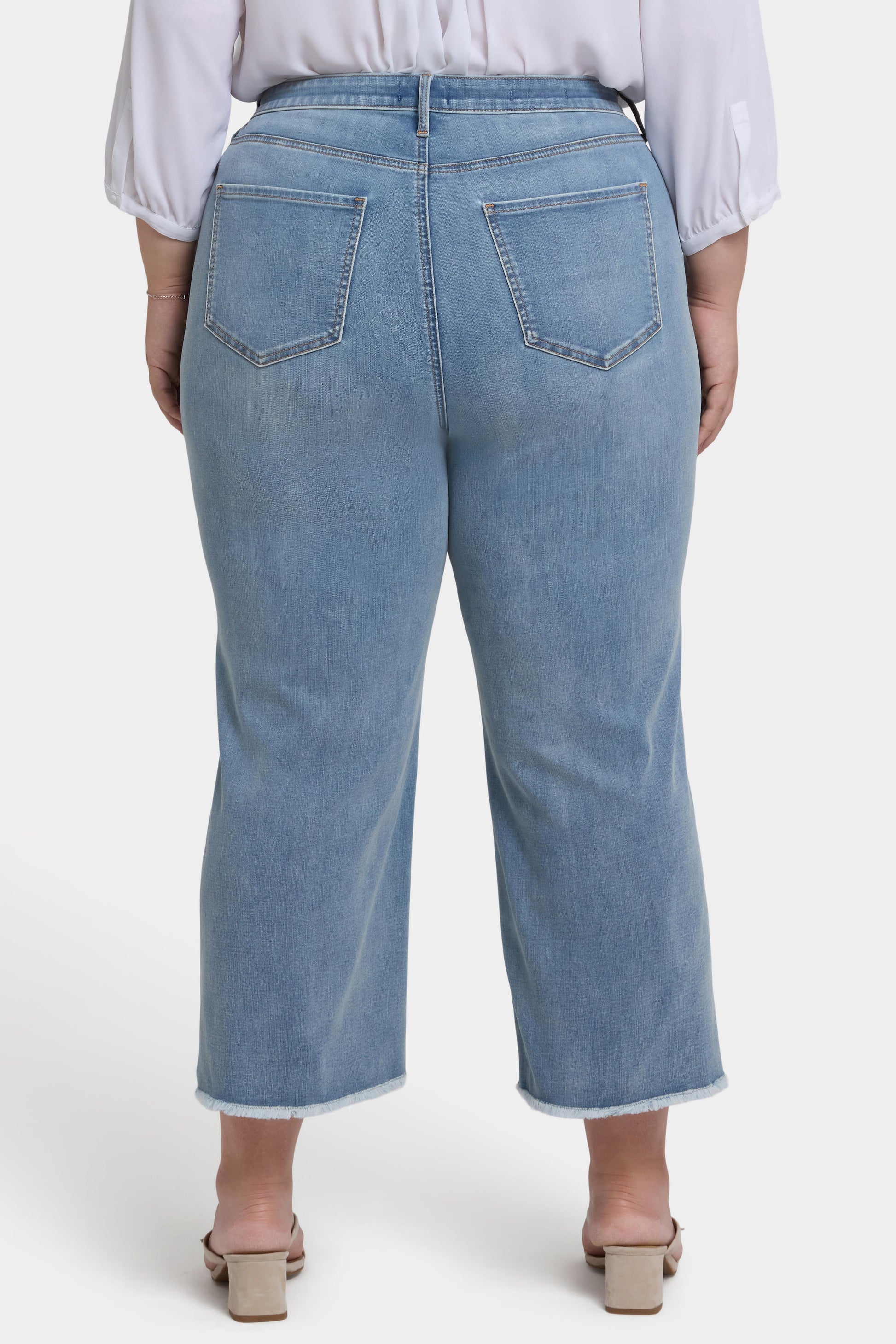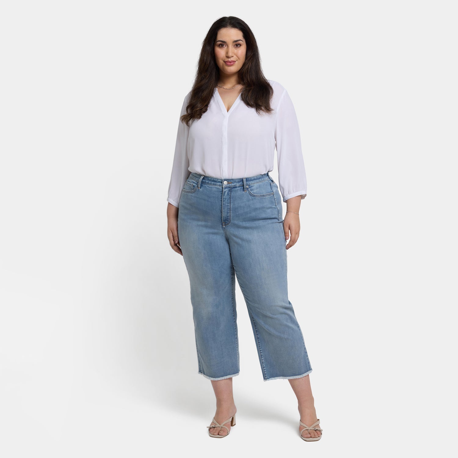 The Coco Relaxed Wide Leg Crop Jeans in Plus Size by NYDJ have a chic silhouette with a loose leg that smooths your curves while looking laid back. Breathable, temperature-regulating Cool Embrace® Denim keeps you comfortable as the heat rises. Lift Tuck® Technology uses a proprietary slimming panel with a patented criss-cross design to enhance your natural shape. Finished with a zip fly, button closure, five-pocket styling and frayed hems. Santiago Sea is a vintage-inspired light blue wash with soft sanding and whiskers for a classic look. This jean is made with earth-friendly methods that result in reduced consumption of water, chemicals and/or energy.