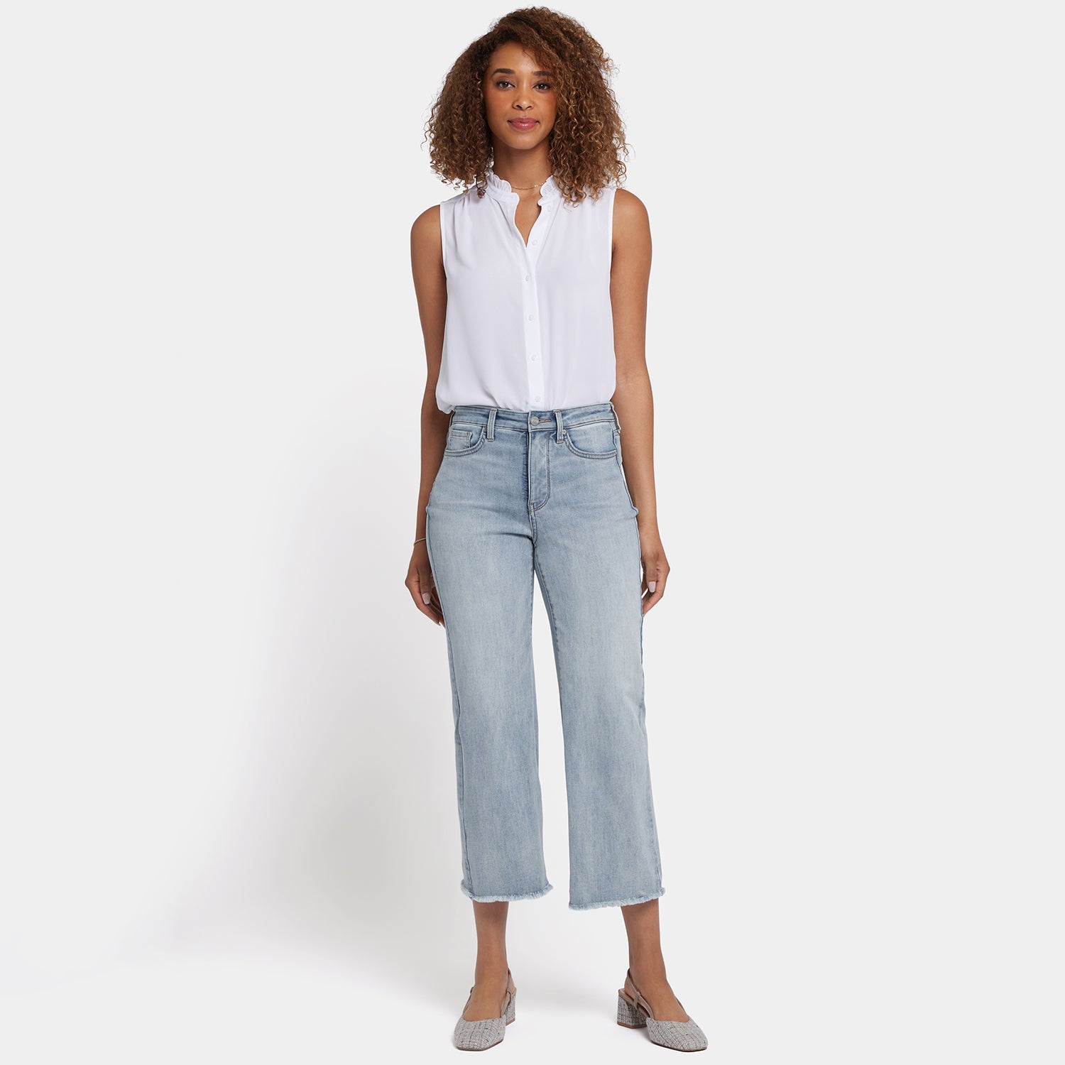 The Coco Relaxed Wide Leg Crop Jeans by NYDJ have a chic silhouette with a loose leg that smooths your curves while looking laid back. Breathable, temperature-regulating Cool Embrace® Denim keeps you comfortable as the heat rises. Lift Tuck® Technology uses a proprietary slimming panel with a patented criss-cross design to enhance your natural shape. Finished with a zip fly, button closure, five-pocket styling and frayed hems. Santiago Sea is a vintage-inspired light blue wash with soft sanding and whiskers for a classic look. This jean is made with earth-friendly methods that result in reduced consumption of water, chemicals and/or energy.