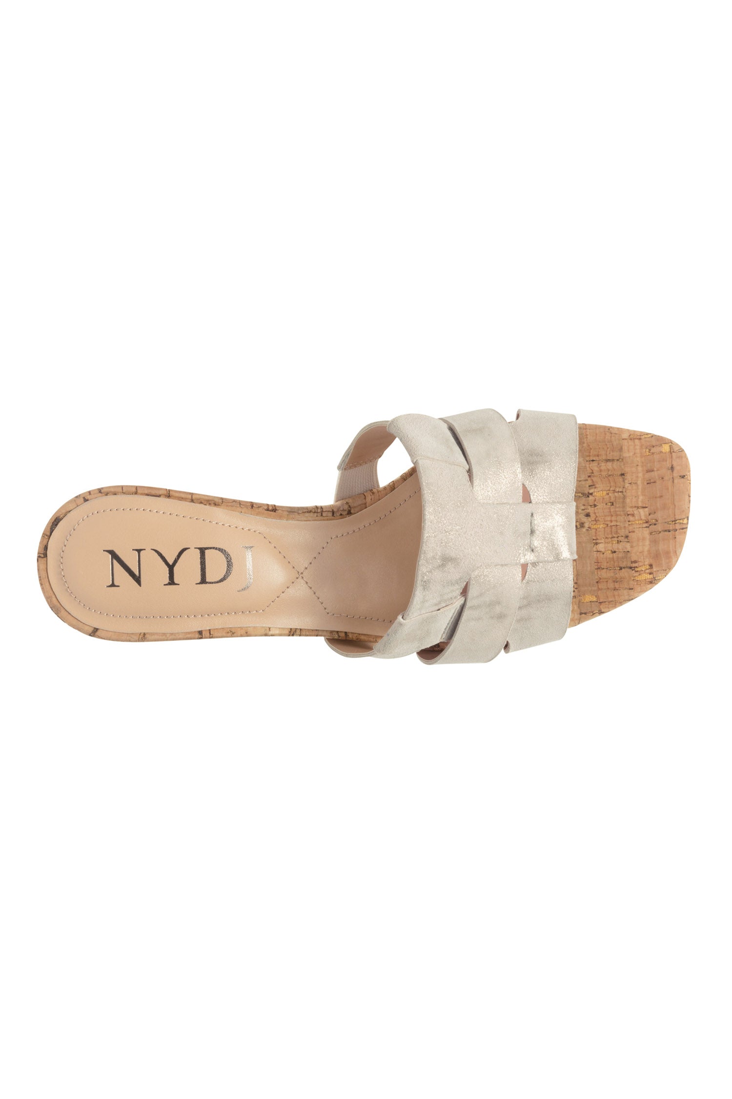 NYDJ's Gloriana Mule Sandals in Metallic Suede have a sleek silhouette that's enhanced by a square toe and a woven upper design that elegantly frames the foot. This slip-on style is finished with a cork-wrapped insole and heel, memory foam insole padding and a partially recycled rubber outsole with plenty of grip.