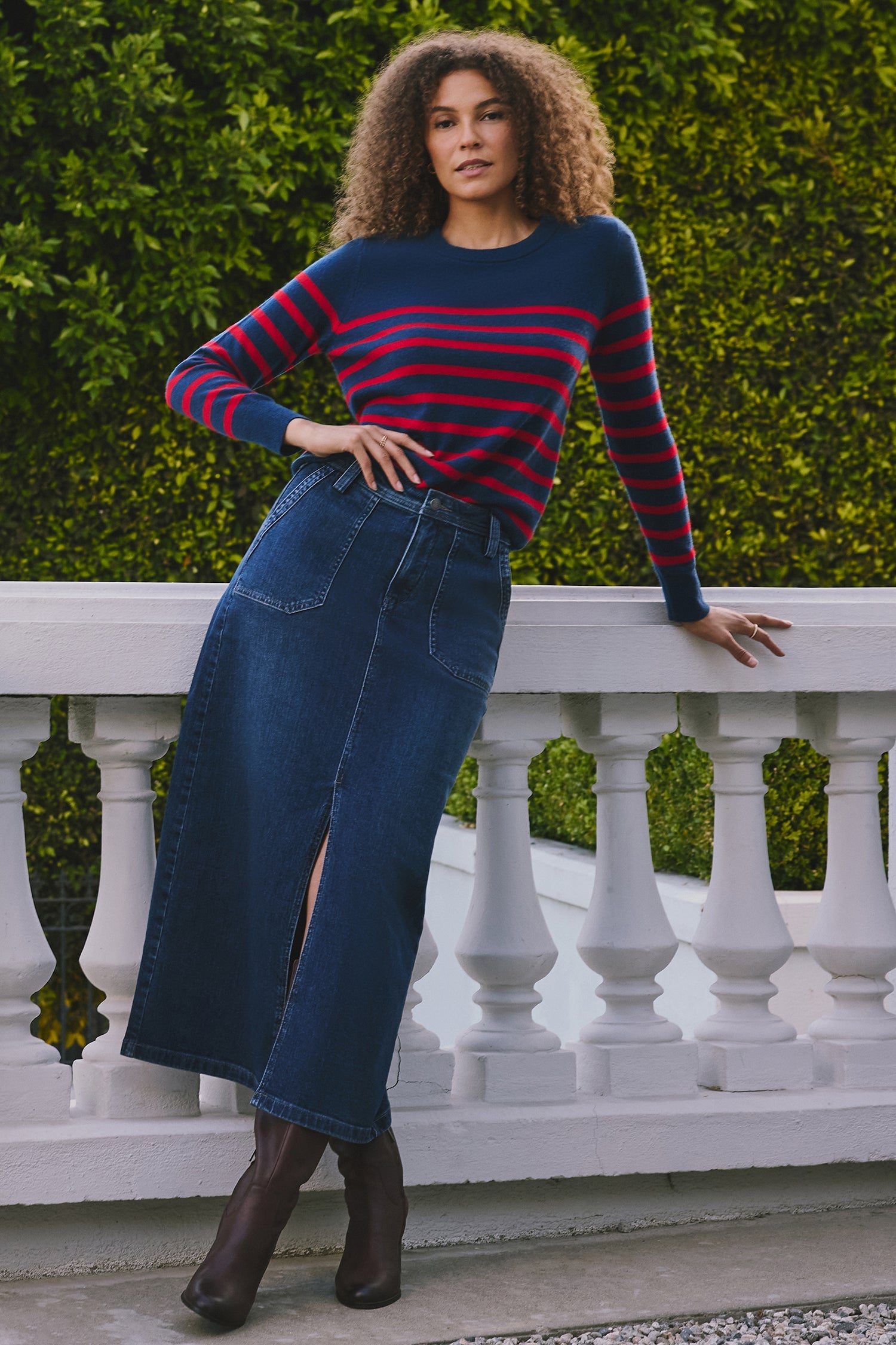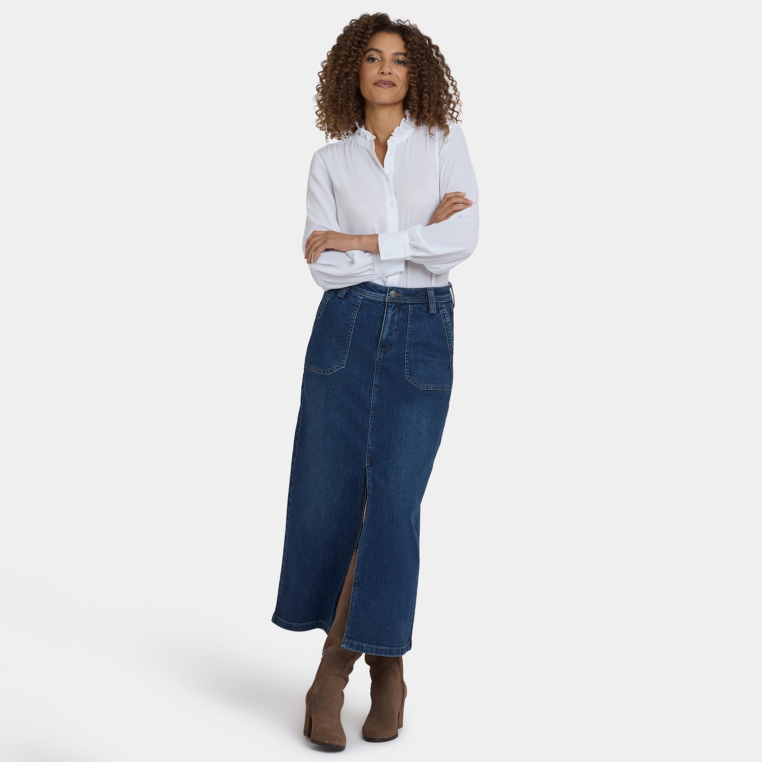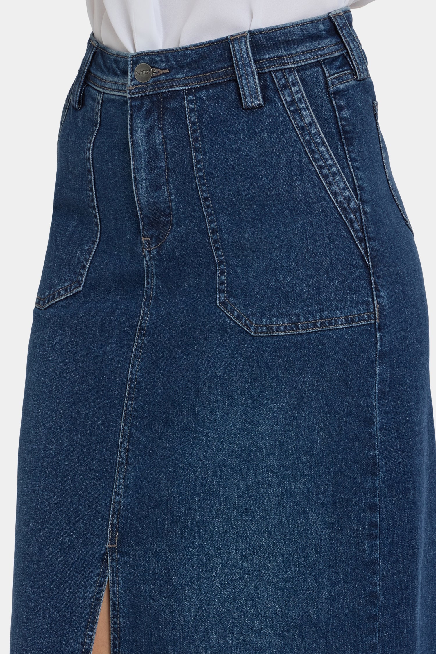 NYDJ's High Rise Long Skirt is a classic wardrobe staple that you'll get endless wears out of all season long. Our signature Lift Tuck® Technology provides just the right amount of support for a smooth, flawless figure—all thanks to an innovative, proprietary slimming panel with a patented criss-cross design. Finished with deep front utility pockets, back patch pockets, zip fly, button closure and center front slit for ease of movement. Louvre Sapphire is a classic medium-dark indigo wash with minimal hand sanding. This skirt is made with earth-friendly methods that result in reduced consumption of water, chemicals and/or energy.