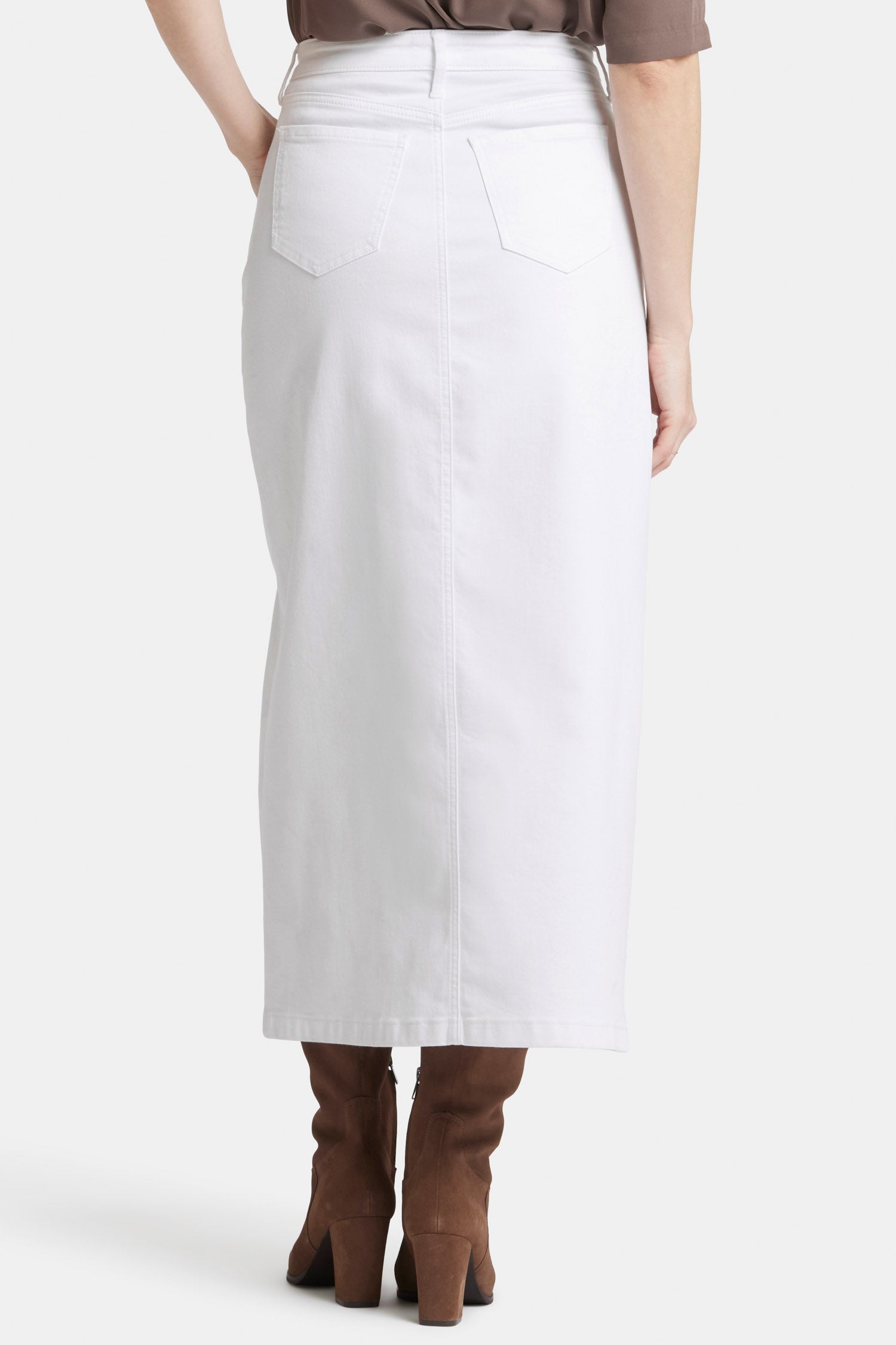 NYDJ's High Rise Long Skirt is a classic wardrobe staple that you'll get endless wears out of all season long. Our signature Lift Tuck® Technology provides just the right amount of support for a smooth, flawless figure—all thanks to an innovative, proprietary slimming panel with a patented criss-cross design. Finished with five-pocket styling, zip fly, button closure and center front slit for ease of movement. This skirt is made with earth-friendly methods that result in reduced consumption of water, chemicals and/or energy.