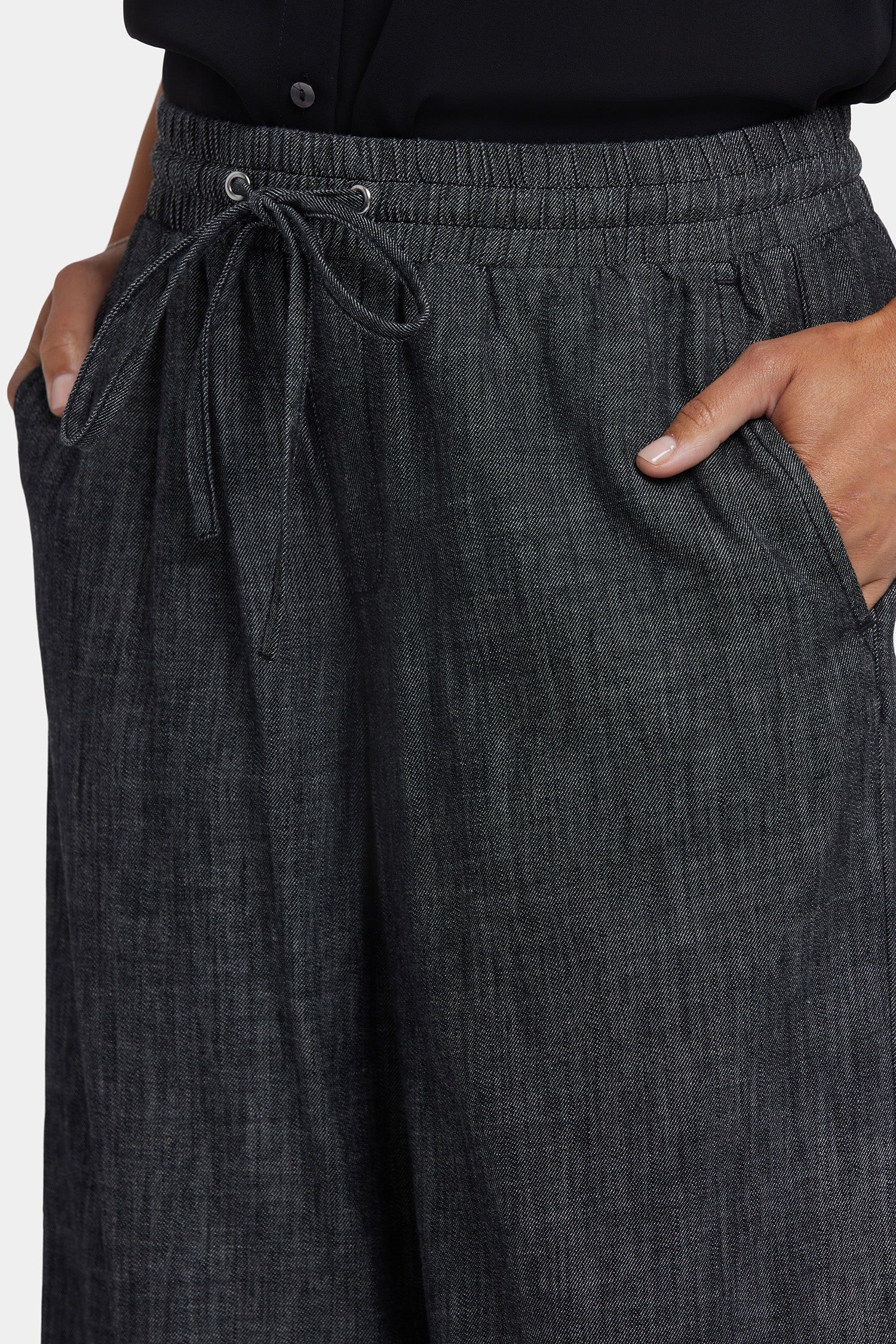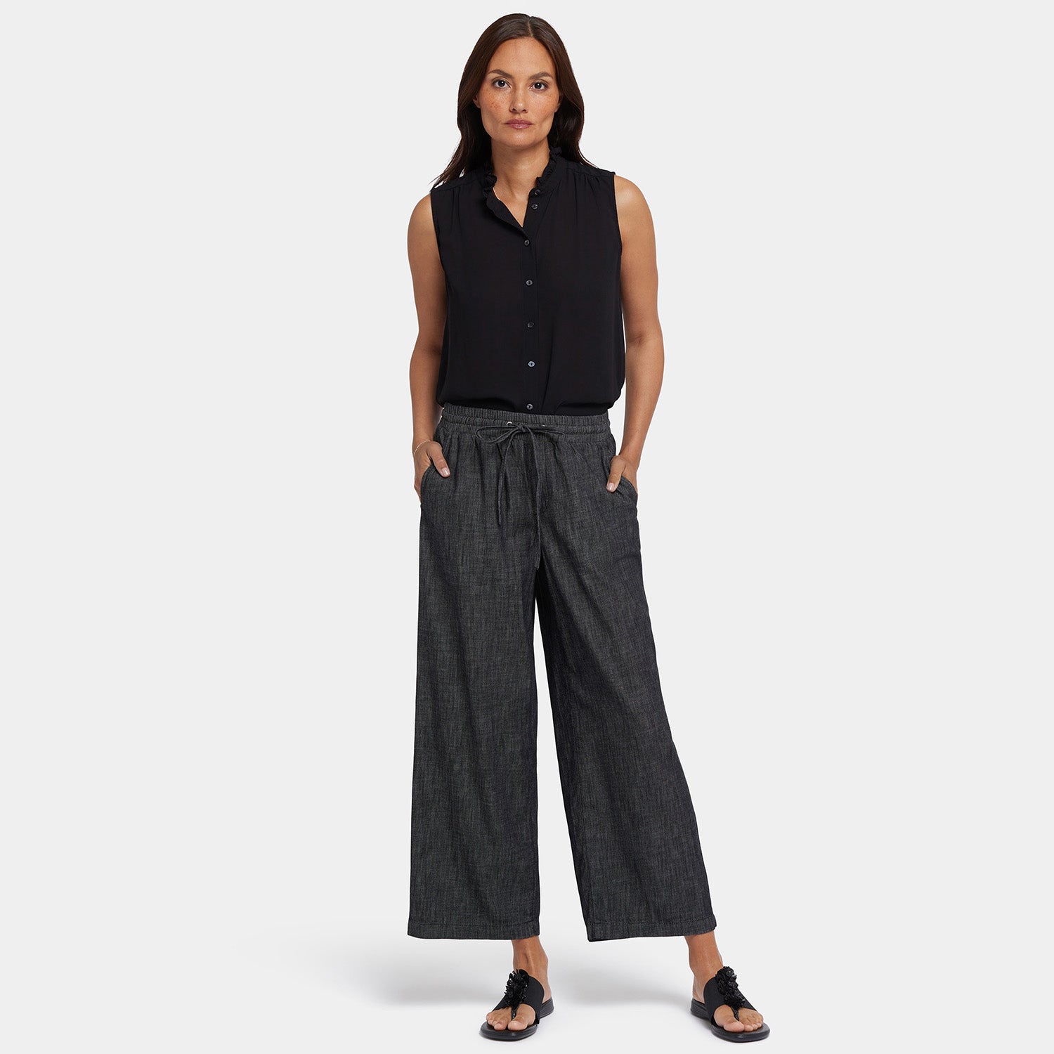 NYDJ's Jayne Pull-On Wide Leg Ankle Pants in Petite make a bold statement, stealing the show effortlessly. With flowy wide legs and a flattering fit, this pair has a stretch waist with an adjustable drawstring closure. Soft lightweight denim provides a comfortable, breezy feel. These pants are made with earth-friendly methods that result in reduced consumption of water, chemicals and/or energy.