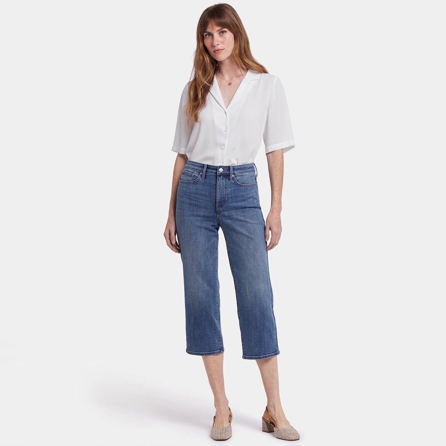 Easy warm-weather style just got breezier with NYDJ's Joni Relaxed Capri Jeans in Petite with High Rise. Featuring a relaxed fit through the legs, these capri jeans look laid back and on trend. A high rise and our signature Lift Tuck® Technology keep the fit smooth and flattering through the midsection. Finished with classic five-pocket styling and a zip fly with button closure. Majorca Bay is a medium blue wash with authentic worn-in sanding and whiskers. This jean is made with earth-friendly methods that result in reduced consumption of water, chemicals and/or energy.