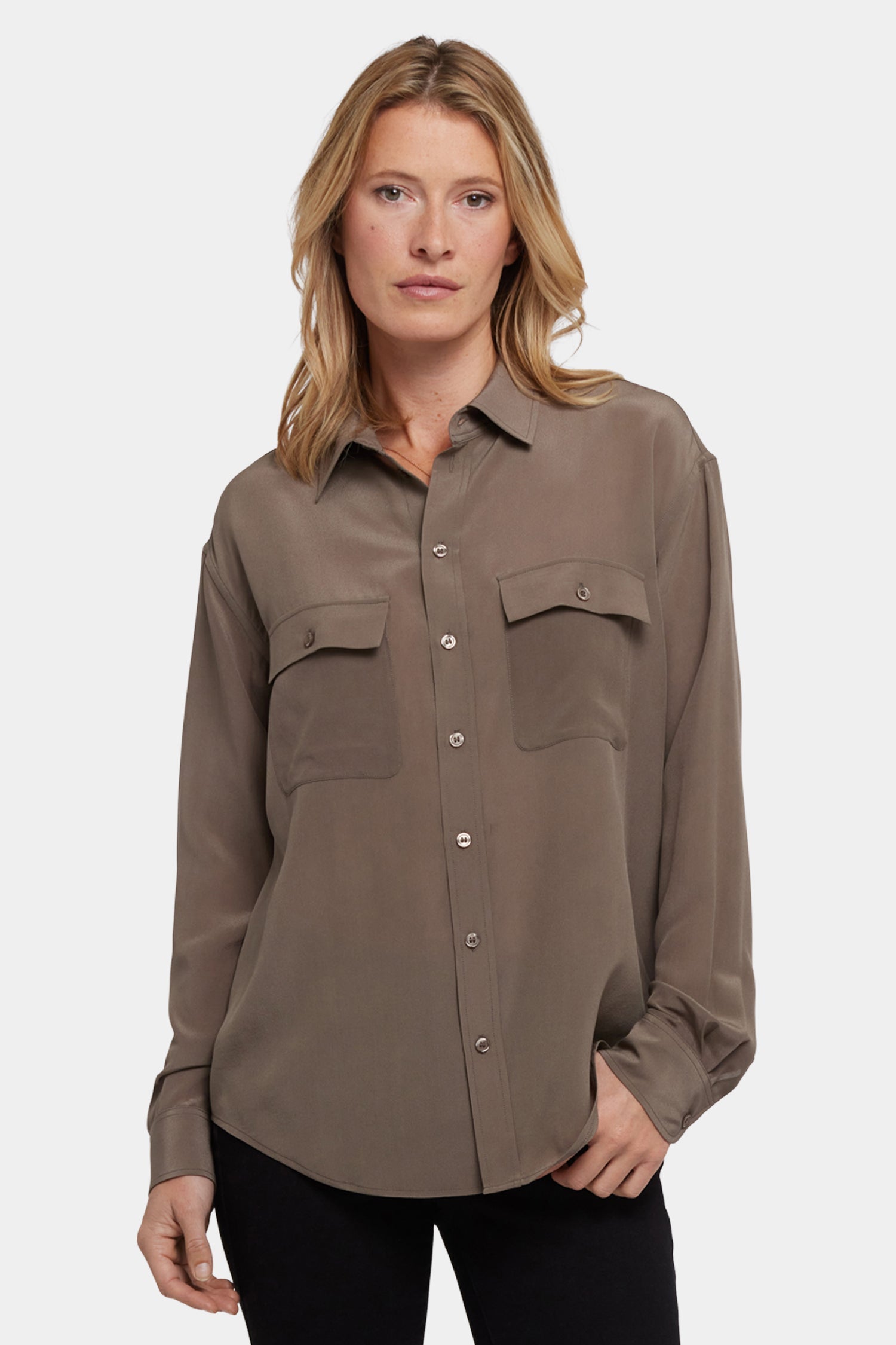 Luxe with a utility twist, the Lauren Silk Blouse by NYDJ has classic shirting details including a point collar, a front button closure, long sleeves with button cuffs and a curved hem. The fit is just relaxed enough to pair with any jean or pant silhouette, and the design is finished with front button-flap patch pockets.