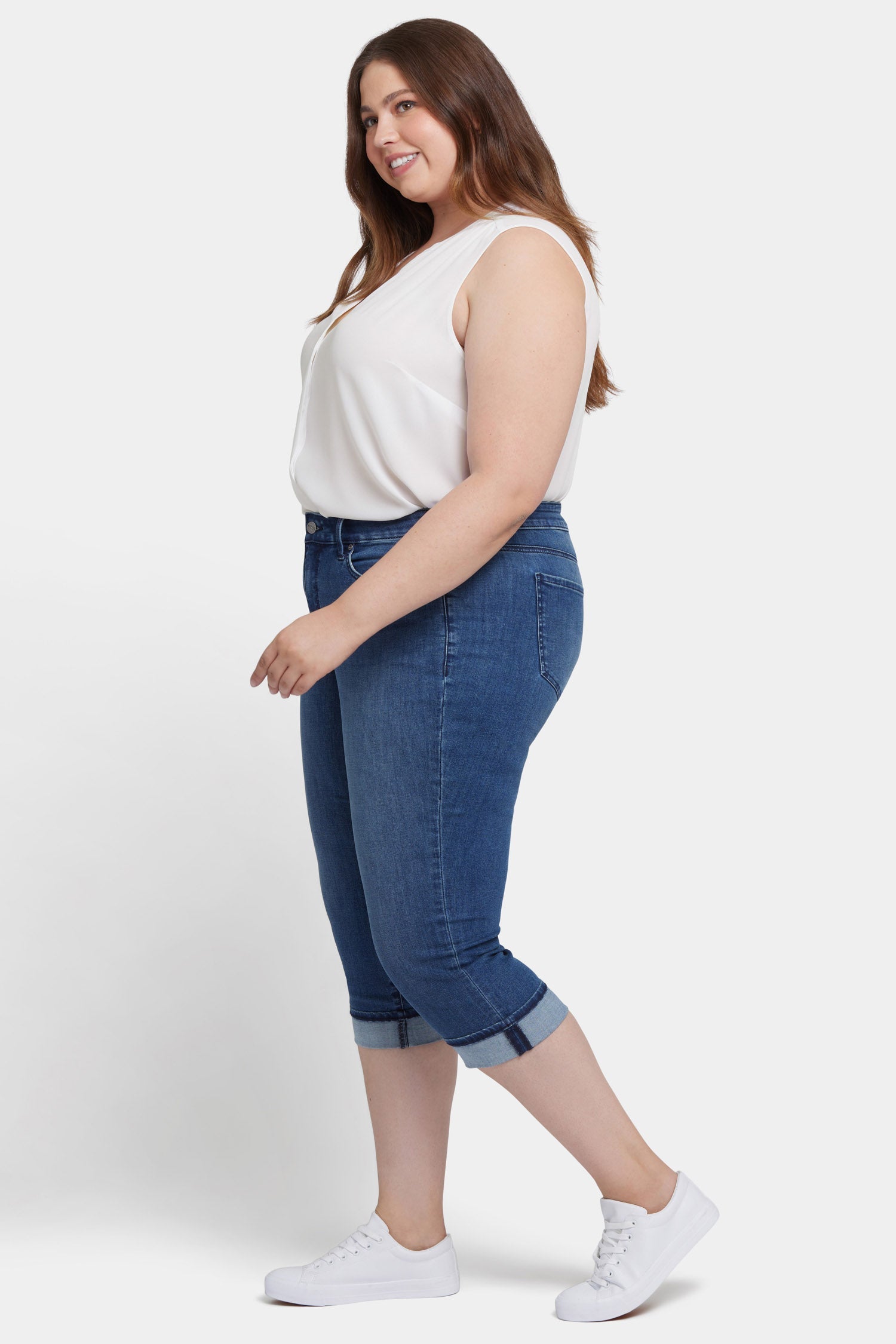 You can't go wrong with our iconic bestselling fit. The curve-sculpting, figure-elongating construction of NYDJ's Marilyn Straight Crop Jeans in Plus Size in Cool Embrace® Denim pairs well with everything, in a cropped straight-leg silhouette with a cuffed hem. Breathable, temperature-regulating Cool Embrace® Denim keeps you comfortable as the heat rises, while our Lift Tuck® Technology uses a proprietary slimming panel with a patented criss-cross design to shape and support your curves. Finished with five-pocket styling and a zip fly with button closure. Blue Ridge is a medium-dark blue wash with whiskering on the front hips and sanding on the front thighs, knees and seat. This jean is made with earth-friendly methods that result in reduced consumption of water, chemicals and/or energy.