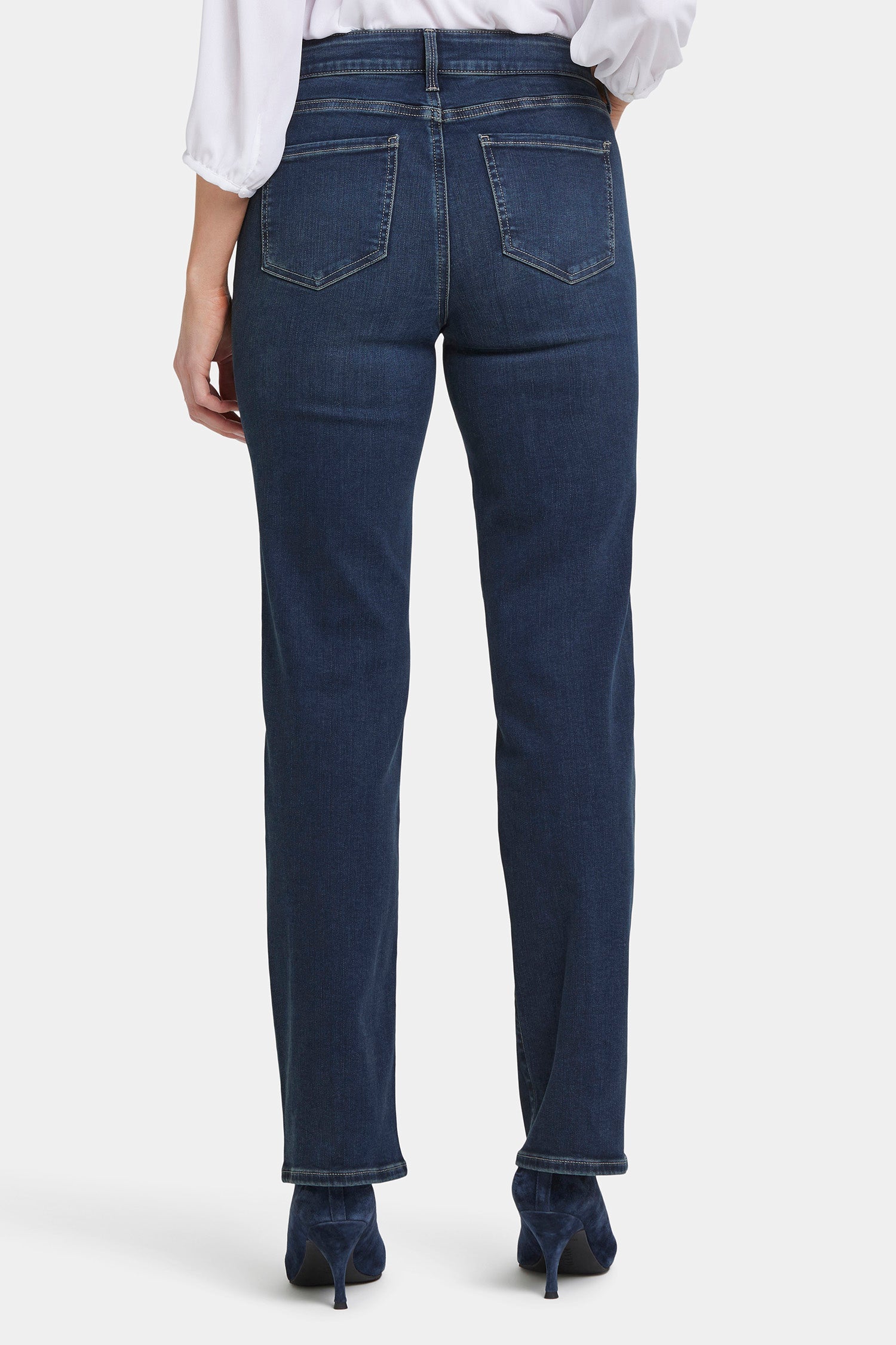 You can't go wrong with our iconic bestselling fit. The curve-sculpting, figure-elongating construction of NYDJ's Marilyn Straight Jeans with High Rise pairs well with everything, in a versatile straight-leg silhouette. This Marilyn Straight style features an even higher rise and a slightly shorter inseam than our typical Marilyn Straight. Plus, our Lift Tuck® Technology uses a proprietary slimming panel with a patented criss-cross design to shape and support your curves. Finished with classic five-pocket styling, zip fly and button closure. Presley is a rich and deep dark blue wash with a heavy brown tint as well as whiskers and fading that give it a worn-in vintage appearance. This jean is made with earth-friendly methods that result in reduced consumption of water, chemicals and/or energy.
