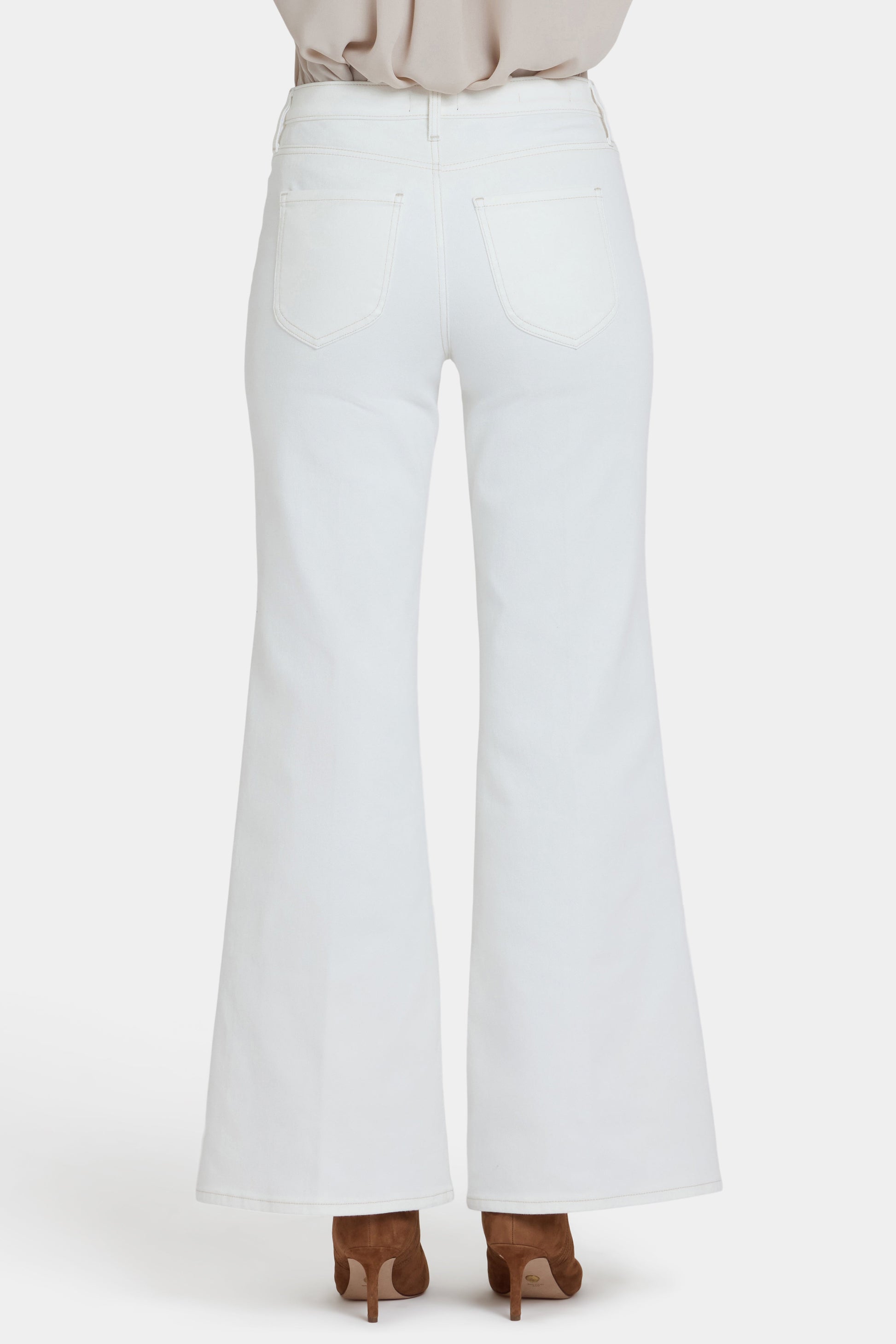 NYDJ's Mia Palazzo Jeans make a bold, breezy statement with their super-flared legs. Sitting high on the waist, this pair has a flattering fit that hugs the hips and thighs and is detailed with center-leg creases. Our Lift Tuck® Technology uses a proprietary slimming panel with a patented criss-cross design to shape and support your curves for an always-sleek silhouette. Features five-pocket styling and a zip fly with button closure. This jean is made with earth-friendly methods that result in reduced consumption of water, chemicals and/or energy.