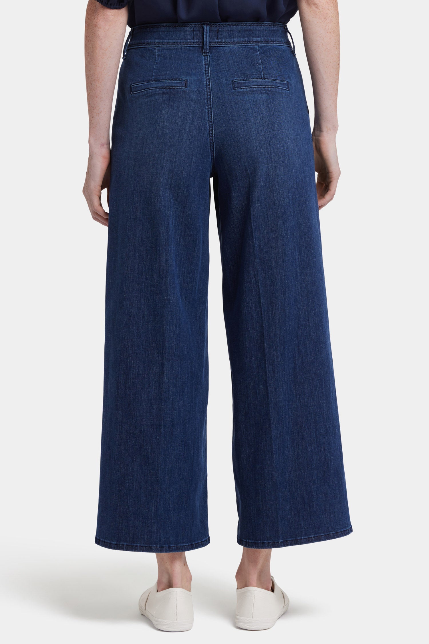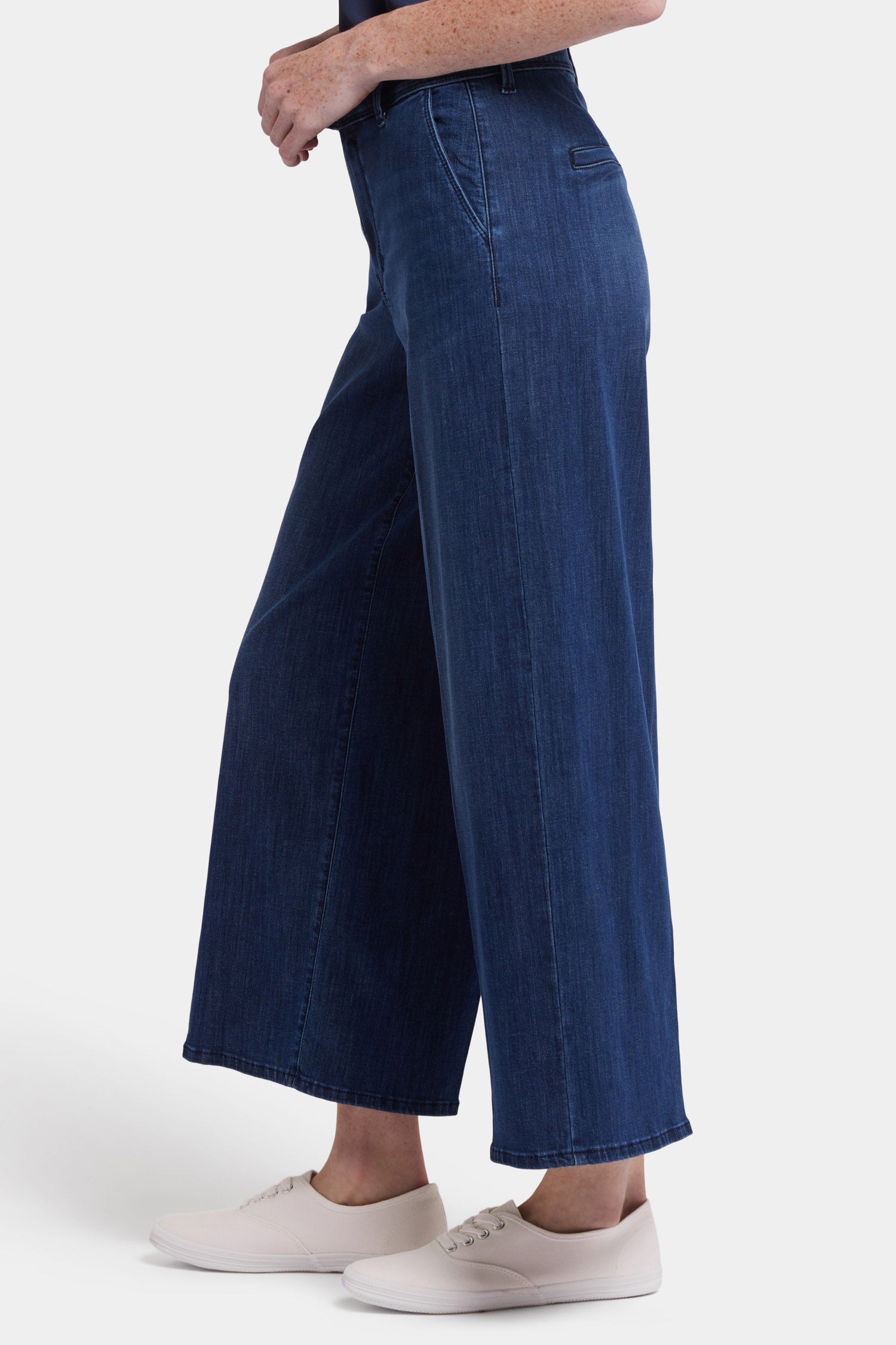 With their dramatic wide legs and flattering high rise, the Mona Wide Leg Trouser Ankle Jeans with High Rise by NYDJ are everything you need in a casual pant. Finished with front slash pockets, back welt pockets, belt loops and a zip fly with button-tab waist. Soft lightweight denim provides a comfortable, breezy feel. Ibiza Blues is a rich dark indigo wash with softly blended whiskers and sanding for a classic look. This jean is made with earth-friendly methods that result in reduced consumption of water, chemicals and/or energy.