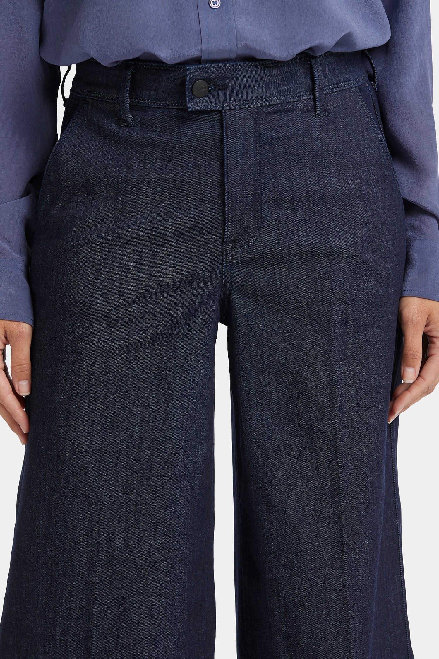 With their dramatic wide legs and flattering high rise, the Mona Wide Leg Trouser Ankle Jeans with High Rise by NYDJ are everything you need in a casual pant. Finished with front slash pockets, back welt pockets, belt loops and a zip fly with button-tab waist. Soft lightweight denim provides a comfortable, breezy feel. Lightweight Rinse is a rich, deep indigo wash. This jean is made with earth-friendly methods that result in reduced consumption of water, chemicals and/or energy.
