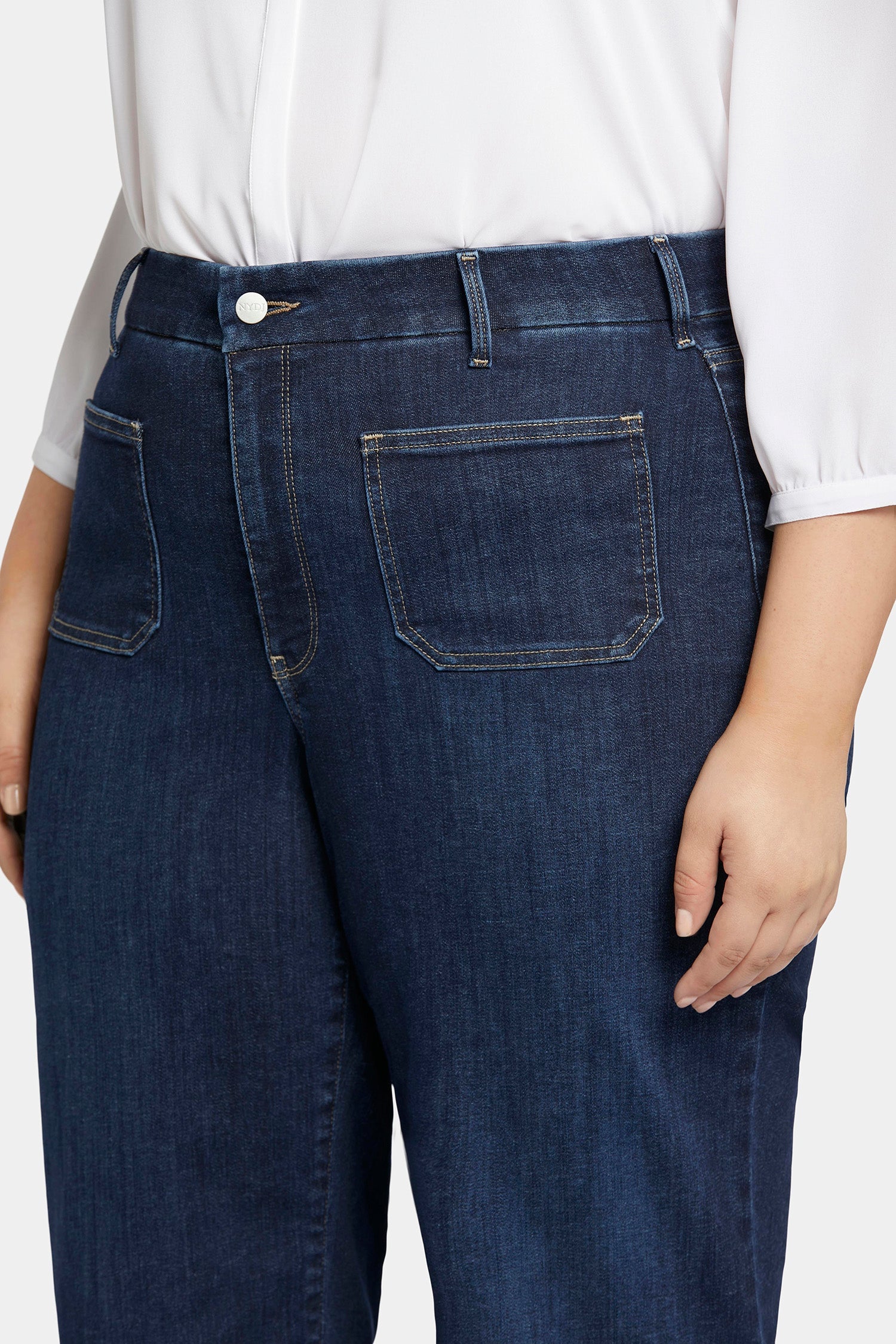 A major wide leg and front patch pockets give NYDJ's Patchie Wide Leg Capri Jeans in Petite Plus Size with Frayed Hems a bold, fashion-forward look. This capri-length jean is also detailed with cutoff hems, keeping the styling laid back. Our Lift Tuck® Technology uses a proprietary slimming panel with a patented criss-cross design to shape and support your curves while providing a smoother fit in front. Finished with a zip fly, button waist, back pockets and pressed creases in front and back. Sublime is a dark indigo wash with subtle whiskering and gentle hand sanding on the thighs and seat.