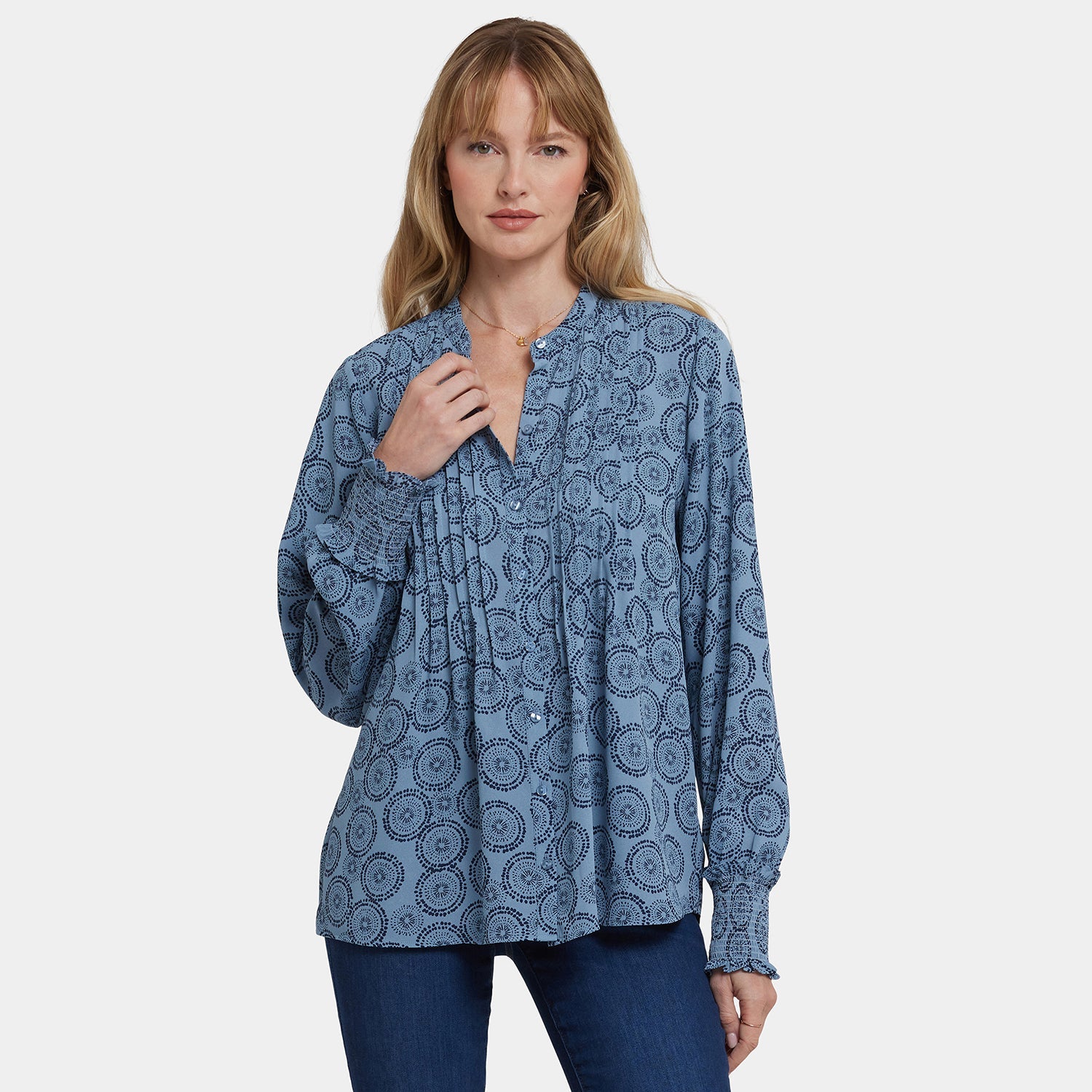 With vintage-inspired details and a soft, romantic silhouette, NYDJ's Pleated Peasant Blouse is perfect for dressing up your favorite denim. Front and back pleats and long, full sleeves gathered into stretch-smock cuffs give it a lovely handcrafted look. Finished with a band collar and front button closure. This blouse's fabric is made with a sustainable polyester fiber created from 100% post-consumer plastic waste, resulting in less water and energy use and fewer greenhouse gas emissions without changing the look and feel of the fabric. The buttons are made with 50% post-consumer recycled polyester.