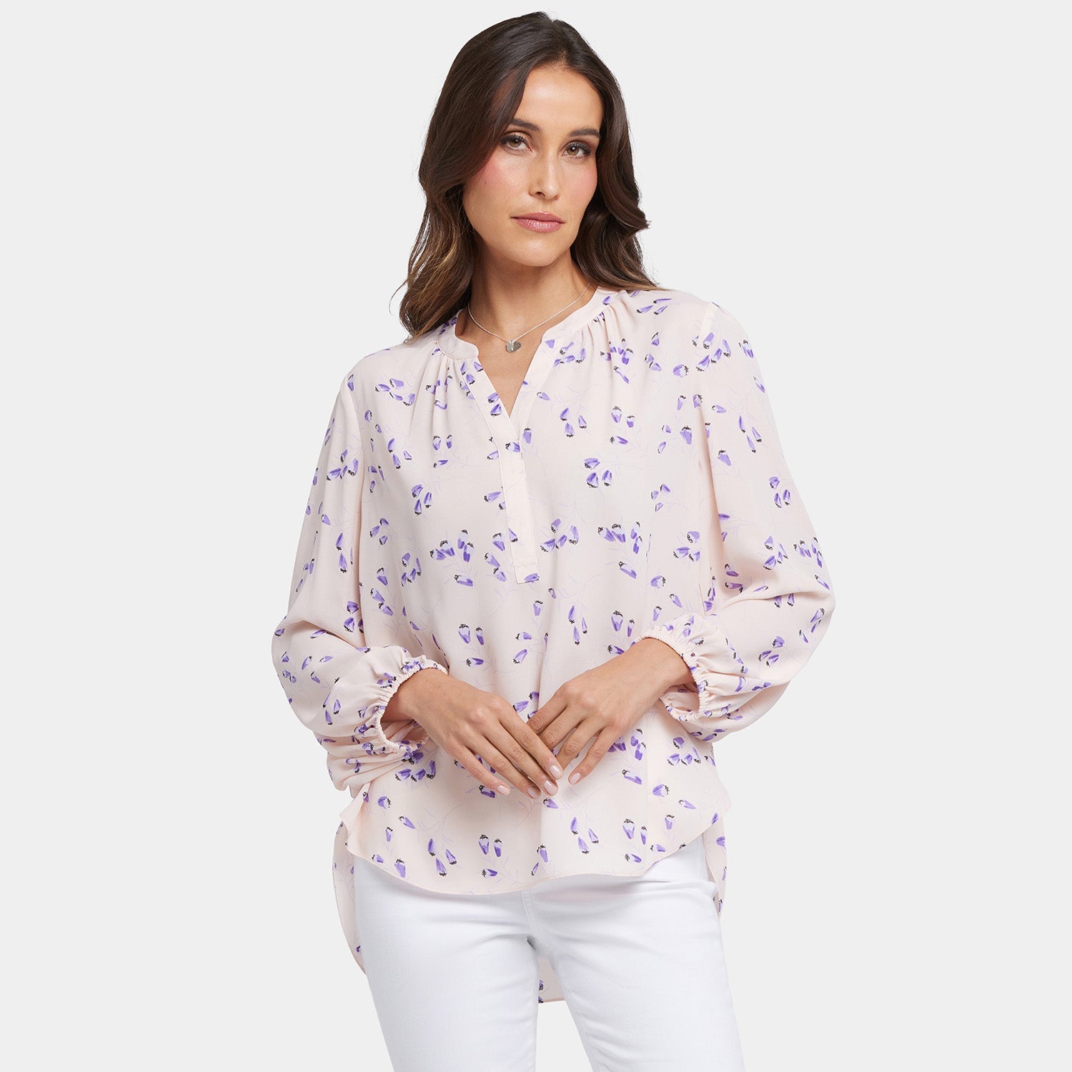 NYDJ's Puff Sleeved Popover Top is made from georgette with an impeccable drape. This breezy blouse is a true wardrobe essential with soft, romantic gathers throughout and voluminous sleeves. Features a split neckline and a high-low hem. This blouse is made with a sustainable polyester fiber created from 100% post-consumer plastic waste, resulting in less water and energy use and fewer greenhouse gas emissions without changing the look and feel of the fabric.