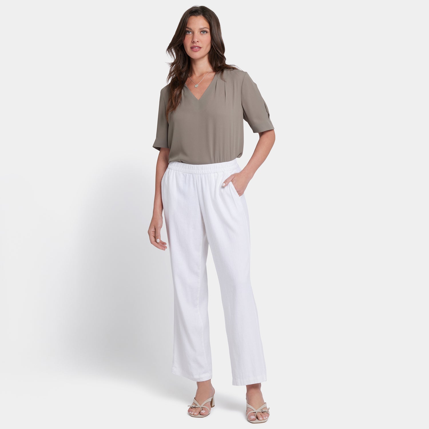 NYDJ's Relaxed Drawstring Pull-On Pants in Stretch Linen are an effortless, easy-to-wear wardrobe essential. Relaxed through the hip and leg with slight tapering from knee to hem, these pants feature front pockets and an adjustable stretch waist with drawstring tie.