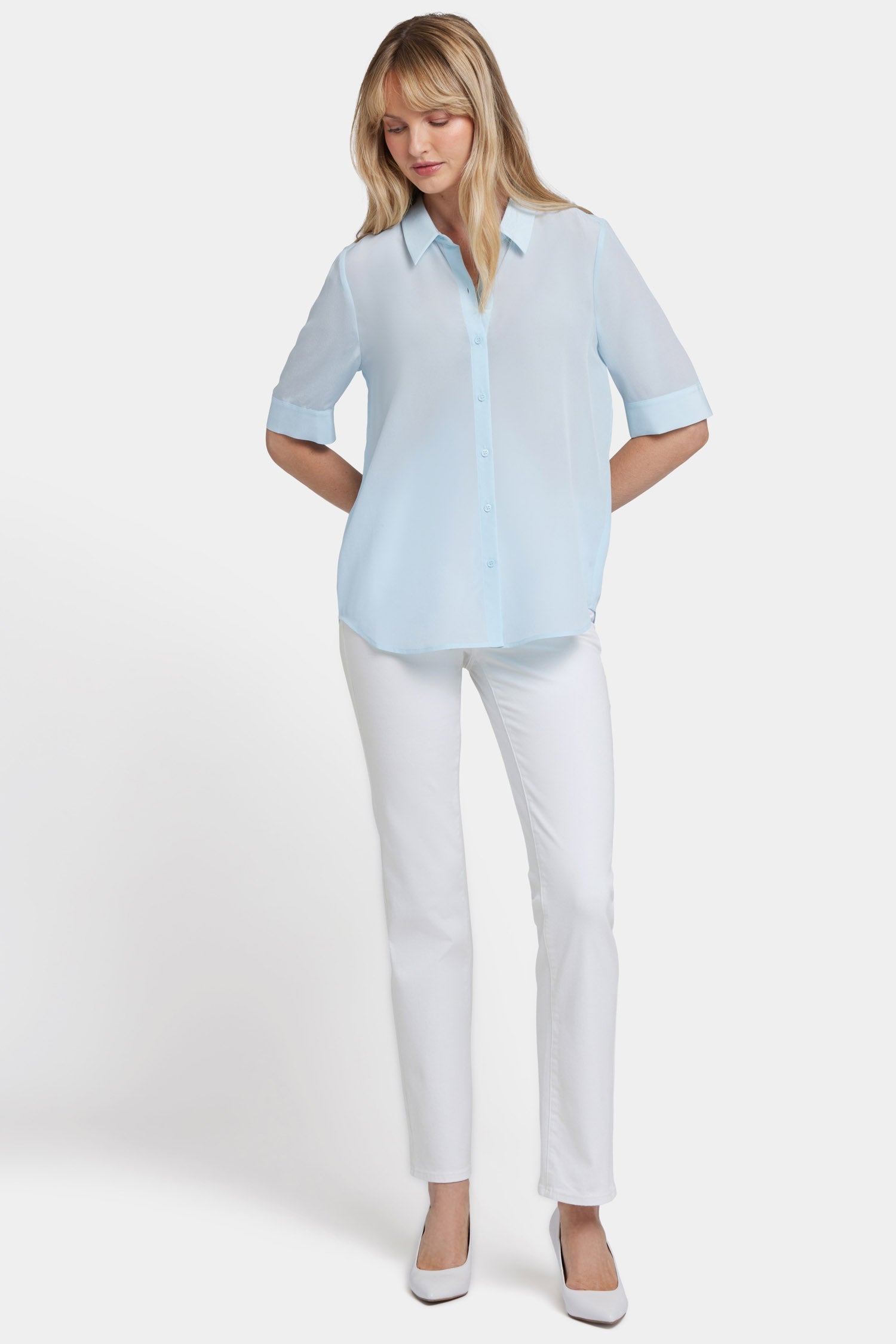 Timeless and refined, NYDJ's Riley Silk Elbow Sleeved Blouse is a key wardrobe piece you'll love forever. This relaxed-fit, button-front style pairs effortlessly with everything from jeans to skirts, adding a polished finish to any look. Features a front button closure and elbow sleeves with button cuffs.