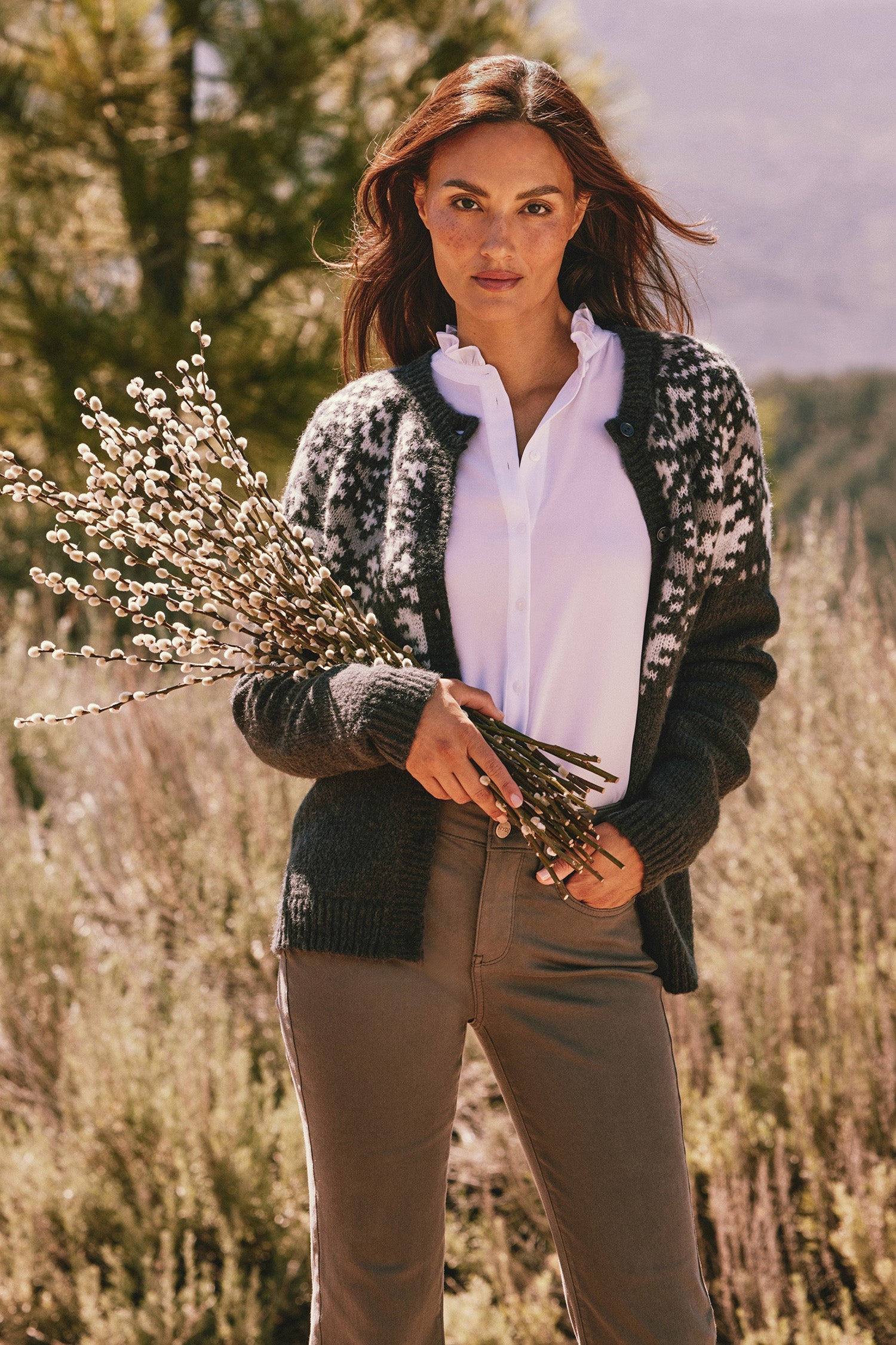 The Ruffle Neck Blouse by NYDJ makes any outfit more feminine with a ruffle-trimmed high collar and pintucked shoulders. This pretty style buttons up the front and has long sleeves. This blouse's fabric is made with a sustainable polyester fiber created from 100% post-consumer plastic waste, resulting in less water and energy use and fewer greenhouse gas emissions without changing the look and feel of the fabric. The buttons are made with 50% post-consumer recycled polyester.