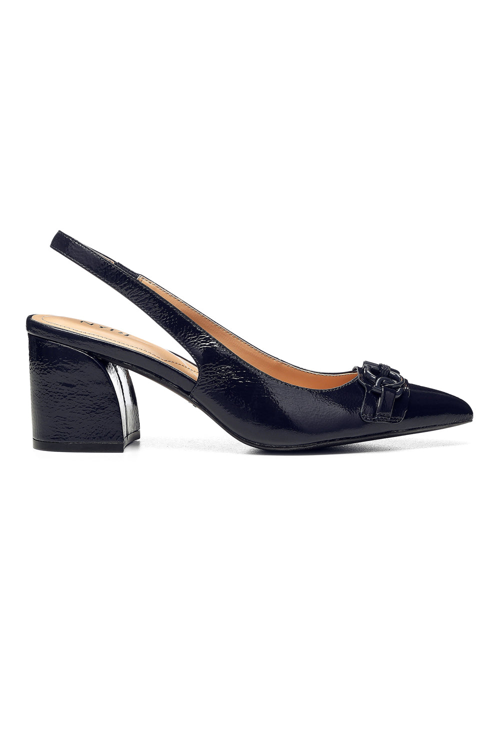The Sanya Slingback Heels by NYDJ feature a sleek profile in a pointed silhouette with a block heel. Crafted with a glossy patent leather upper elevated by a metal bit at the vamp, these slingbacks add the perfect finishing touch to any look. Memory foam padded insoles and flexible partially recycled rubber outsoles make them ultra-comfortable too.