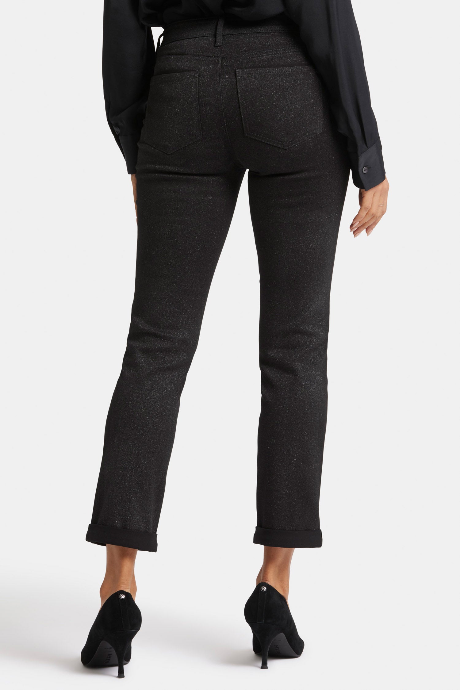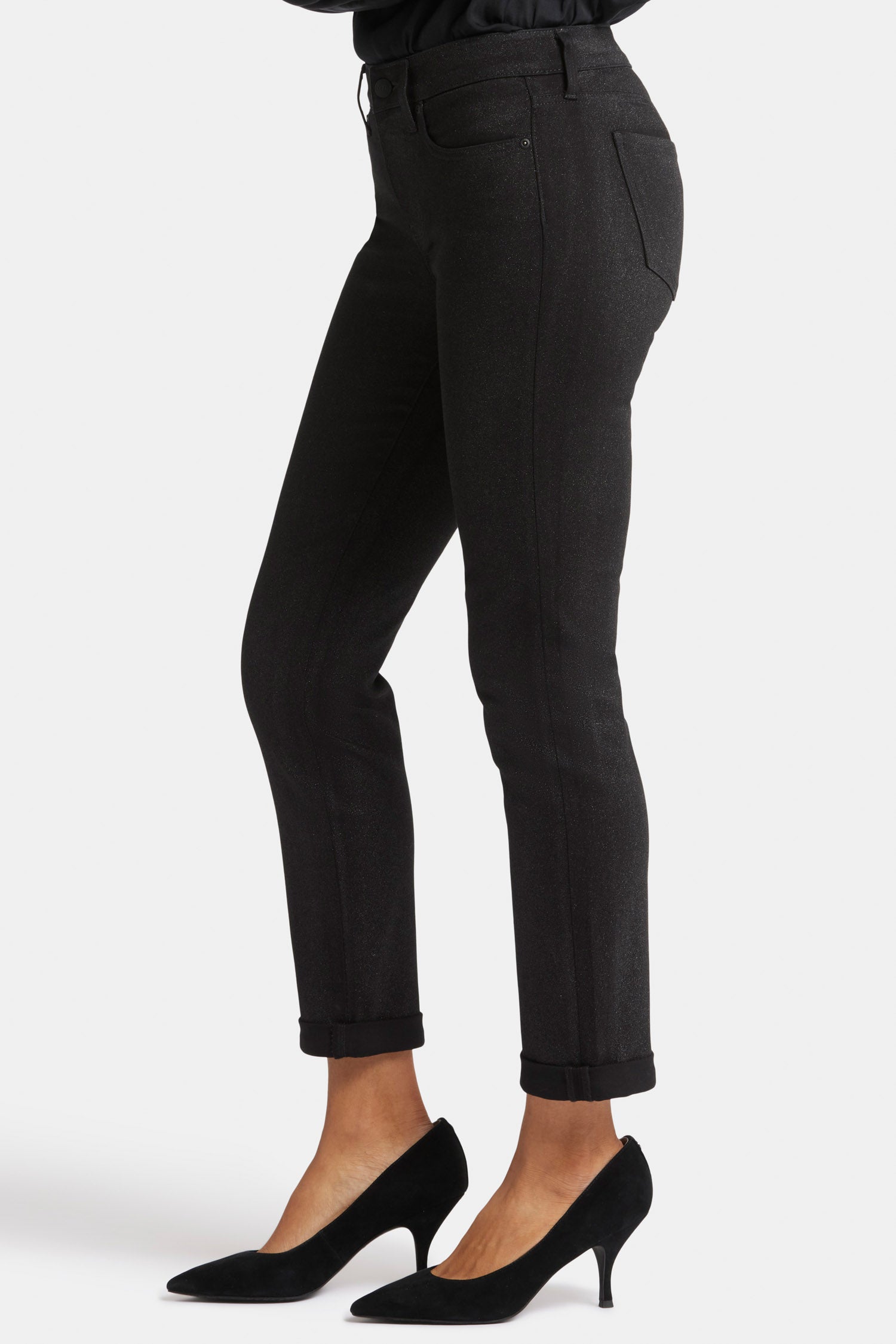 Between skinny and straight, you'll find the perfect body-hugging slim fit in NYDJ's Sheri Slim Ankle Jeans. Lift Tuck® Technology uses a proprietary slimming panel with a patented criss-cross design to shape and support your curves for an always-sleek silhouette. Features classic five-pocket styling, zip fly and button closure. Glamorous is a black wash coated with a glittery silver foil. This jean is made with earth-friendly methods that result in reduced consumption of water, chemicals and/or energy.
