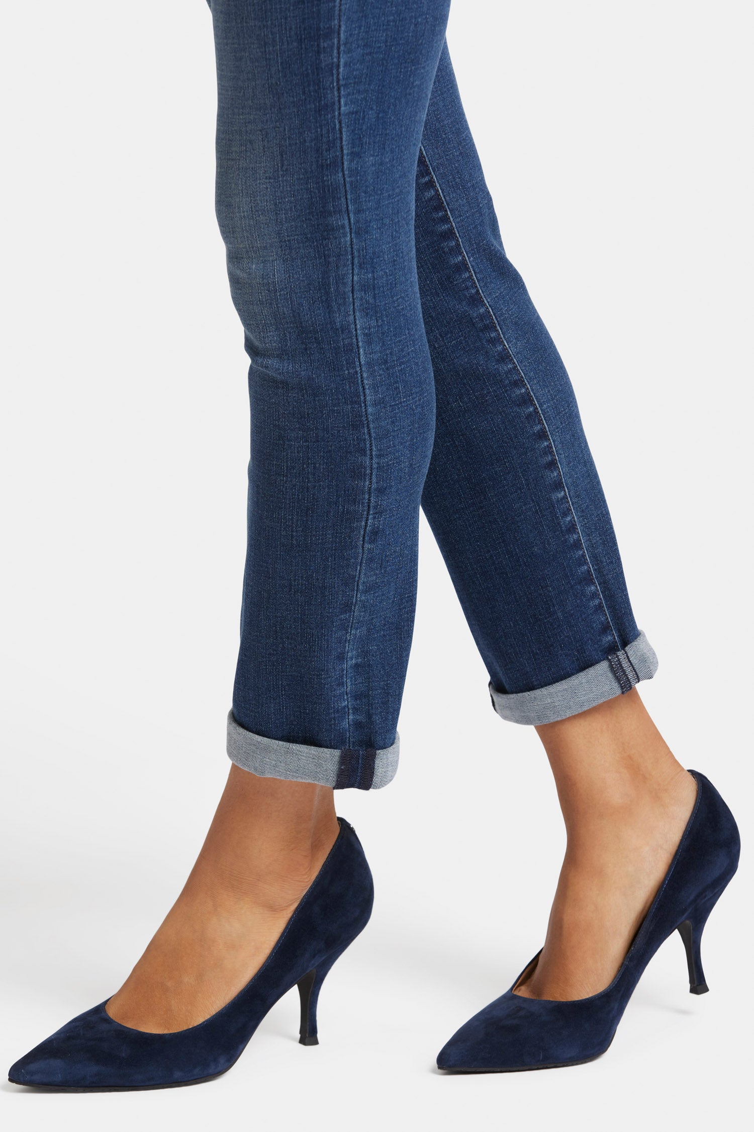 Between skinny and straight, you'll find the perfect body-hugging slim fit in NYDJ's Sheri Slim Ankle Jeans with Roll Cuffs. Lift Tuck® Technology uses a proprietary slimming panel with a patented criss-cross design to shape and support your curves for an always-sleek silhouette. Features classic five-pocket styling, zip fly and button closure. Wellspring is a classic dark indigo wash with softly blended sanding. This jean is made with earth-friendly methods that result in reduced consumption of water, chemicals and/or energy.
