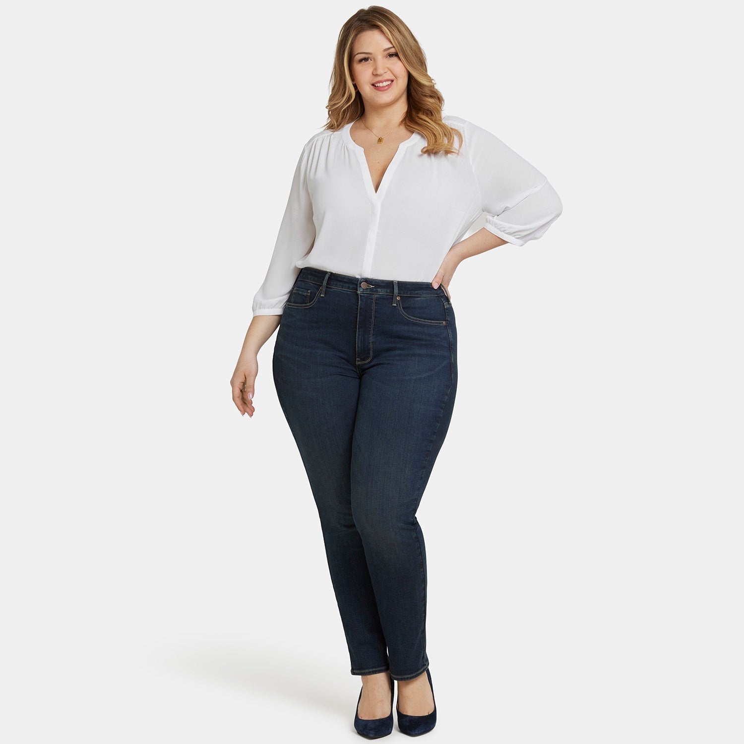Between skinny and straight, you'll find the perfect body-hugging slim fit in NYDJ's Sheri Slim Jeans in Plus Size with High Rise. Lift Tuck® Technology uses a proprietary slimming panel with a patented criss-cross design to shape and support your curves for an always-sleek silhouette. Features classic five-pocket styling, zip fly and button closure. Presley is a rich and deep dark blue wash with a heavy brown tint as well as whiskers and fading that give it a worn-in vintage appearance. This jean is made with earth-friendly methods that result in reduced consumption of water, chemicals and/or energy.