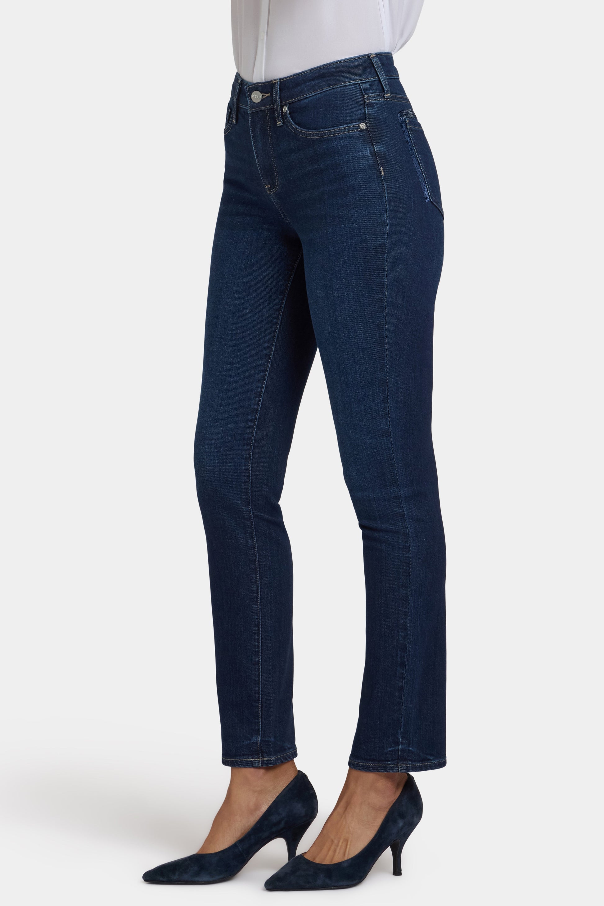 Between skinny and straight, you'll find the perfect body-hugging slim fit in NYDJ's Sheri Slim Jeans. This Sheri Slim style features sequin detail at the back pockets for a glam, party-ready look. Enhance your assets and streamline your silhouette with our signature Lift Tuck® Technology, which flattens and flatters using a proprietary slimming panel with a patented criss-cross design. Finished with five-pocket styling, zip fly and button closure. Indigo Seine is a dark-casted blue wash with soft sanding and whiskering. This jean is made with earth-friendly methods that result in reduced consumption of water, chemicals and/or energy.