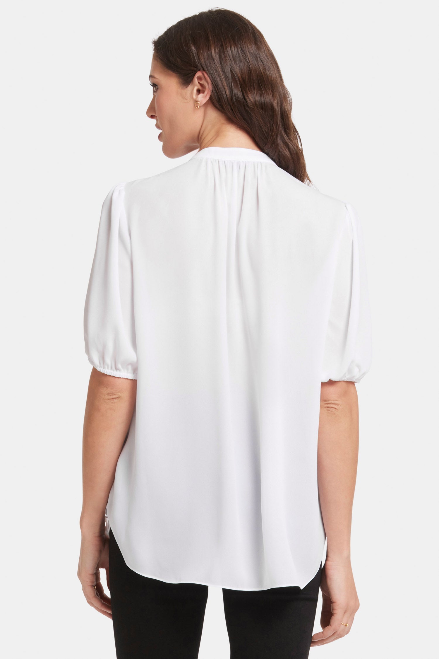 NYDJ's Short Puff Sleeve Popover Top is made from georgette with an impeccable drape. This breezy blouse is a true wardrobe essential with soft, romantic gathers throughout. Features a split neckline. This blouse is made with a sustainable polyester fiber created from 100% post-consumer plastic waste, resulting in less water and energy use and fewer greenhouse gas emissions without changing the look and feel of the fabric.