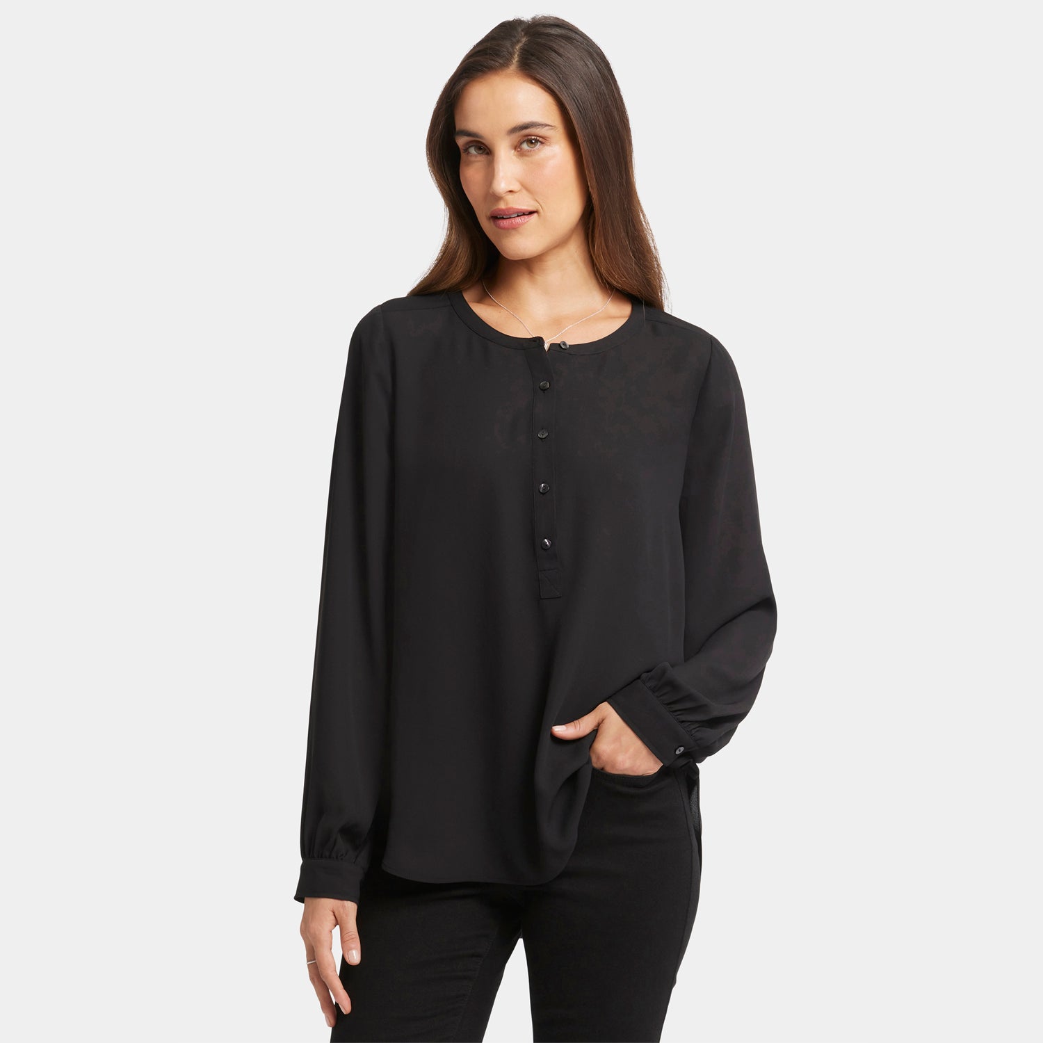 Classic meets chic in the Simone Blouse by NYDJ. This easy, relaxed-fit blouse pairs effortlessly with everything from slimming pants to casual jeans and skirts. It features billowing sleeves accented with soft gathers at the button cuffs, and it's finished with front button closures as well as pleating at the back neck. This blouse's fabric is made with a sustainable polyester fiber created from 100% post-consumer plastic waste, resulting in less water and energy use and fewer greenhouse gas emissions without changing the look and feel of the fabric. The buttons are made with 50% post-consumer recycled polyester.