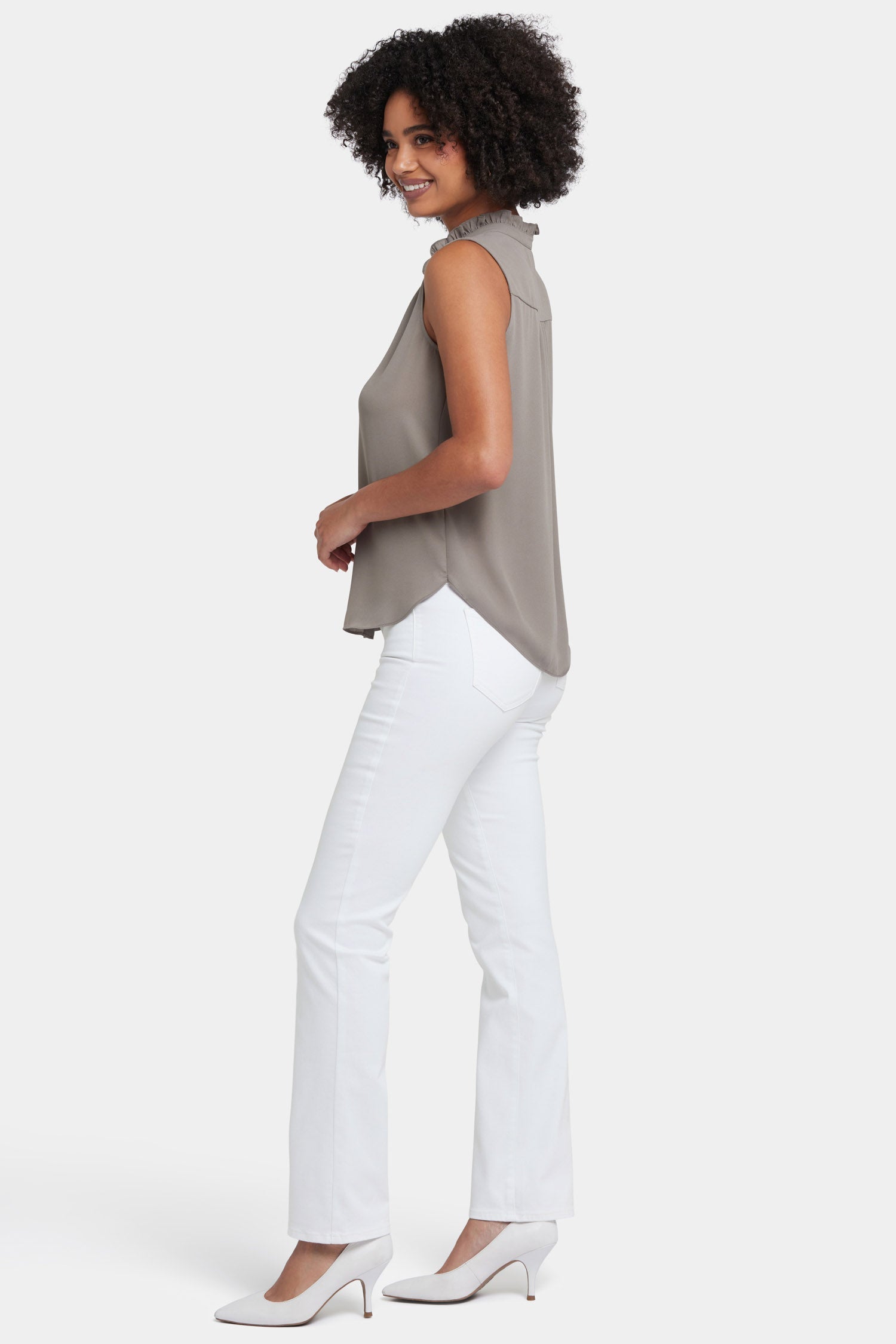 Your essential sleeveless blouse with a romantic twist. The Sleeveless Ruffle Neck Blouse by NYDJ makes any outfit more feminine with a ruffle-trimmed high collar and pintucked shoulders. This pretty style buttons up the front, and the sleeveless design makes it perfect for warm weather or layering under jackets and cardigans. This blouse's fabric is made with a sustainable polyester fiber created from 100% post-consumer plastic waste, resulting in less water and energy use and fewer greenhouse gas emissions without changing the look and feel of the fabric. The buttons are made with 50% post-consumer recycled polyester.