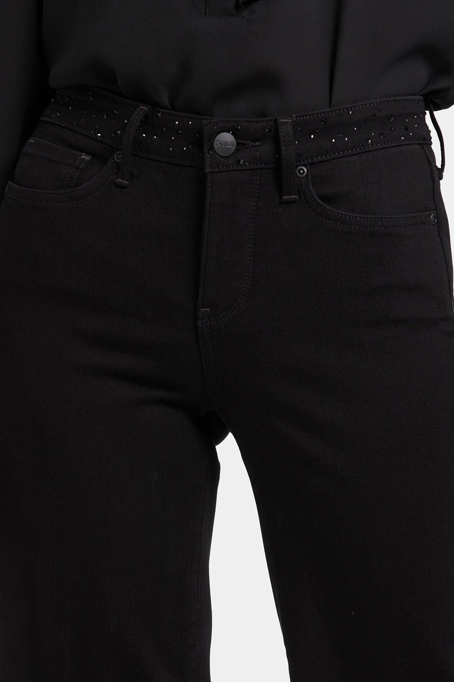 The Teresa Wide Leg Jeans by NYDJ cinch your waist, enhancing your natural silhouette. Our Lift Tuck® Technology is made to help you keep your shape, with a proprietary slimming panel with a patented criss-cross design that smooths and sculpts. These jeans are also made with Sure Stretch® denim technology to give you full range of movement and serious comfort. This style is elevated by a dazzling rhinestone waistband that adds a touch of glamour. Finished with five-pocket styling and a zip fly with button closure. This jean is made with earth-friendly methods that result in reduced consumption of water, chemicals and/or energy.