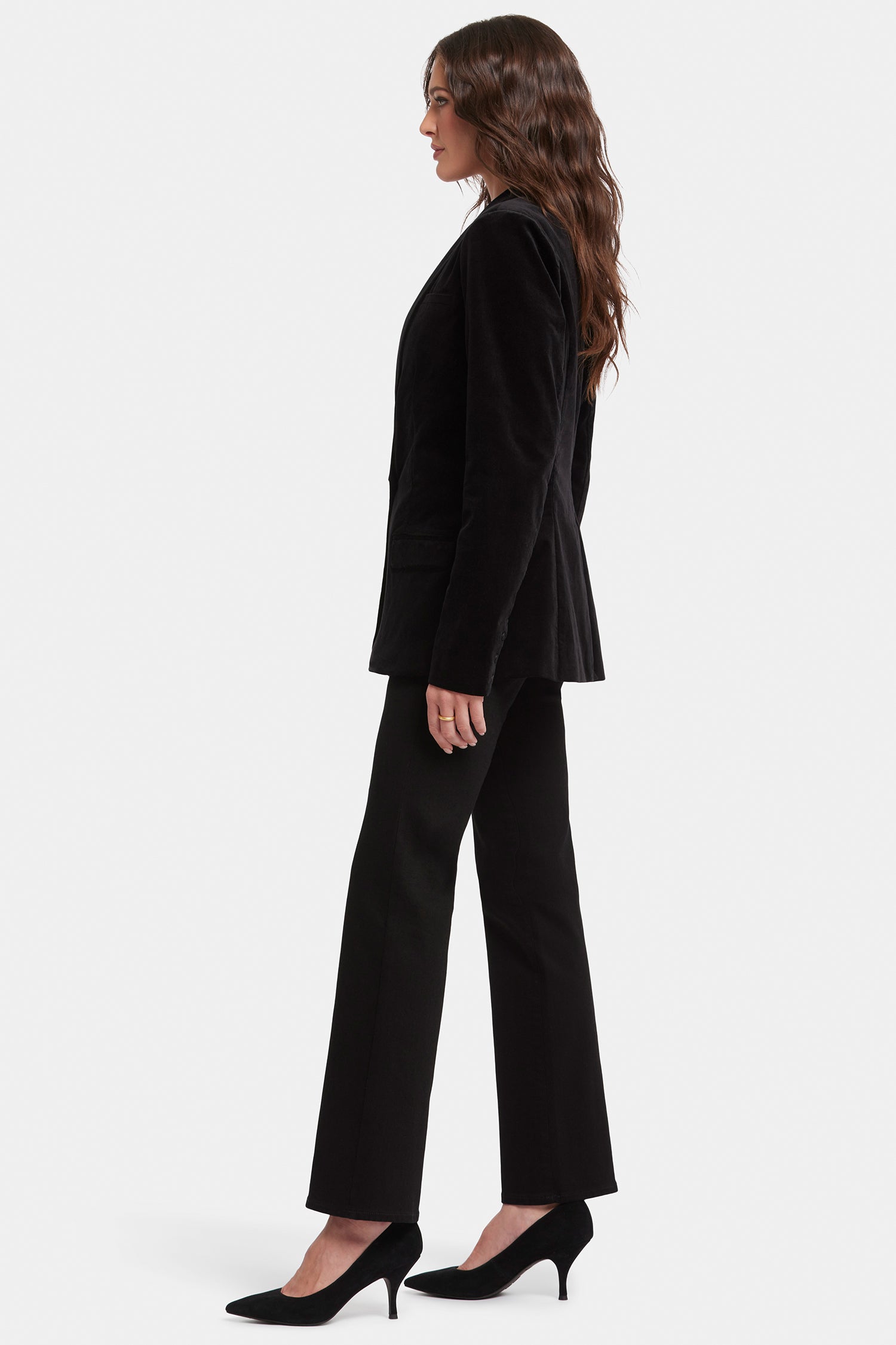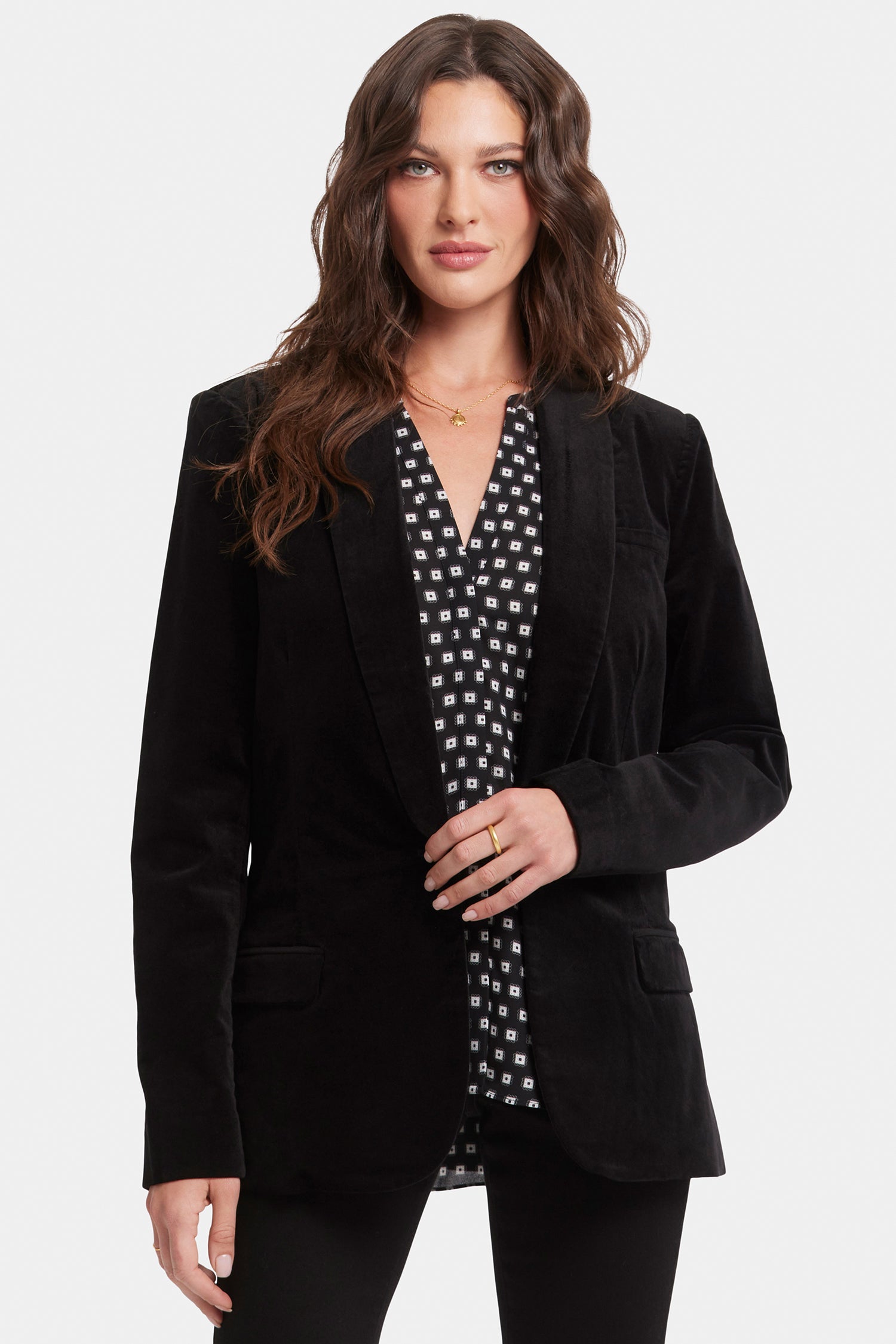 Exude confidence in NYDJ's Tuxedo Jacket In Velveteen. Crafted with inspiration from a menswear staple, this jacket features a shawl collar, flap pockets and a sleek single-breasted design with a front button closure.