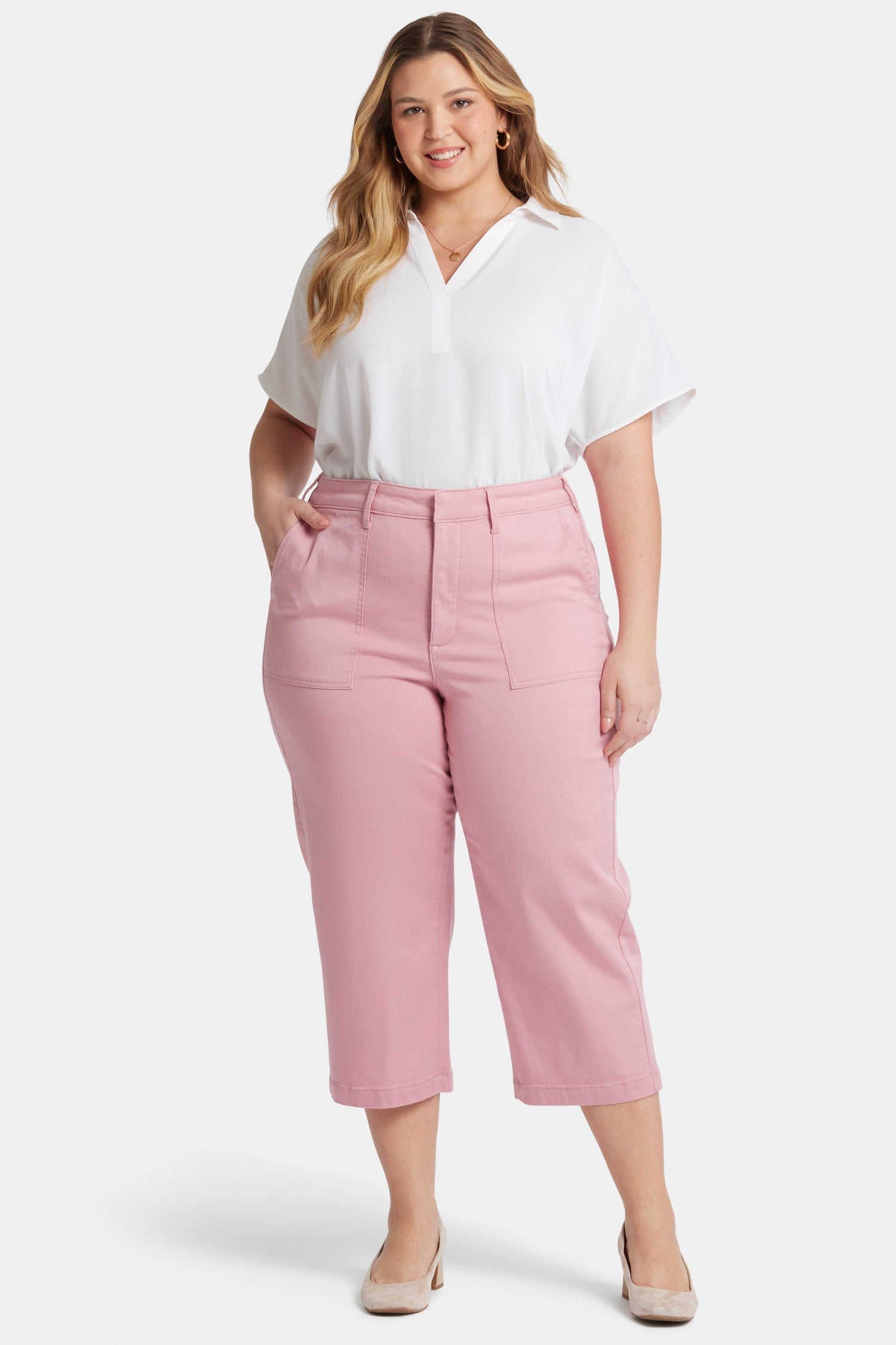 The Utility Pants in Plus Size in Stretch Twill by NYDJ feature a relaxed straight leg with cropped hem for a chic weekend look. Oversized front pockets with angled openings lend these cropped pants a dose of utility-inspired cool. Our signature Lift Tuck® Technology provides just the right amount of support for a smooth, flawless figure - all thanks to an innovative, proprietary slimming panel with a patented criss-cross design. Finished with back patch pockets, zip fly and button closure. This pant is made with earth-friendly methods that result in reduced consumption of water, chemicals and/or energy.
