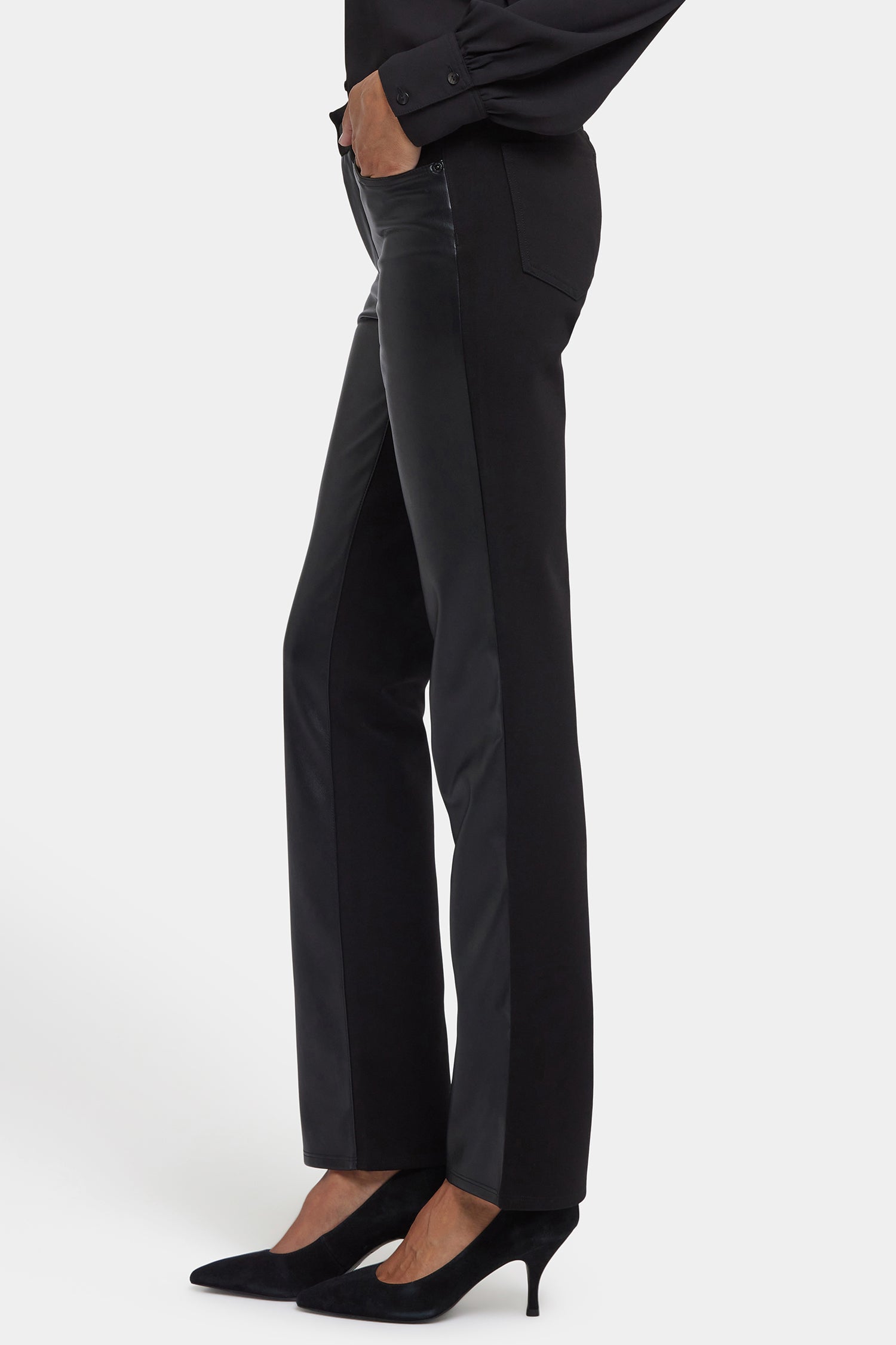 Our most popular silhouette, now in lightweight, super-sculpting compression vegan leather. NYDJ's Vegan Stretch Leather Marilyn Straight Pants in Petite have a flattering and versatile straight-leg fit that elongates the figure, while their texture adds a bold edge to outfits. Lift Tuck® Technology uses a proprietary slimming panel with a patented criss-cross design to shape and support your curves for even more sleekness. The styling of this pair is finished with five pockets and a zip fly with button closure. These pants are part of Sculpt-Her™, NYDJ's most novel collection of compression-contouring silhouettes with an unparalleled, cutting-edge fit.