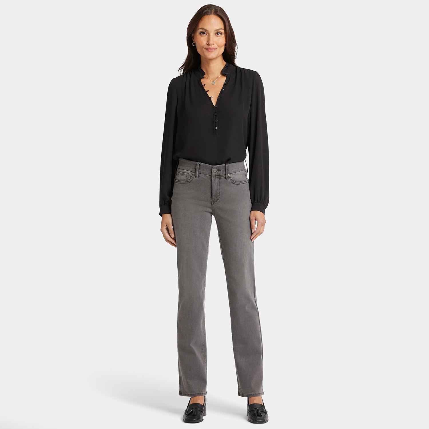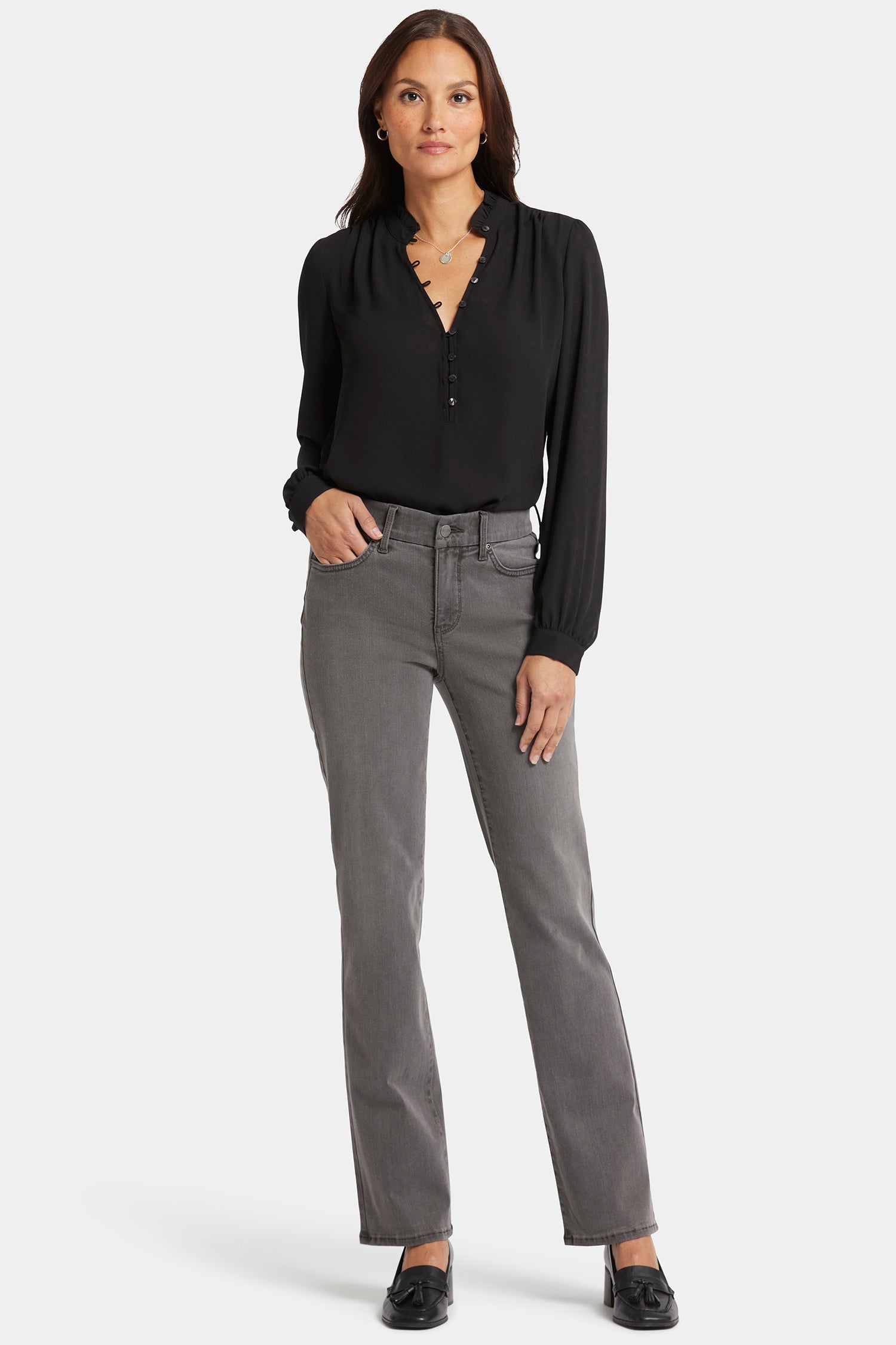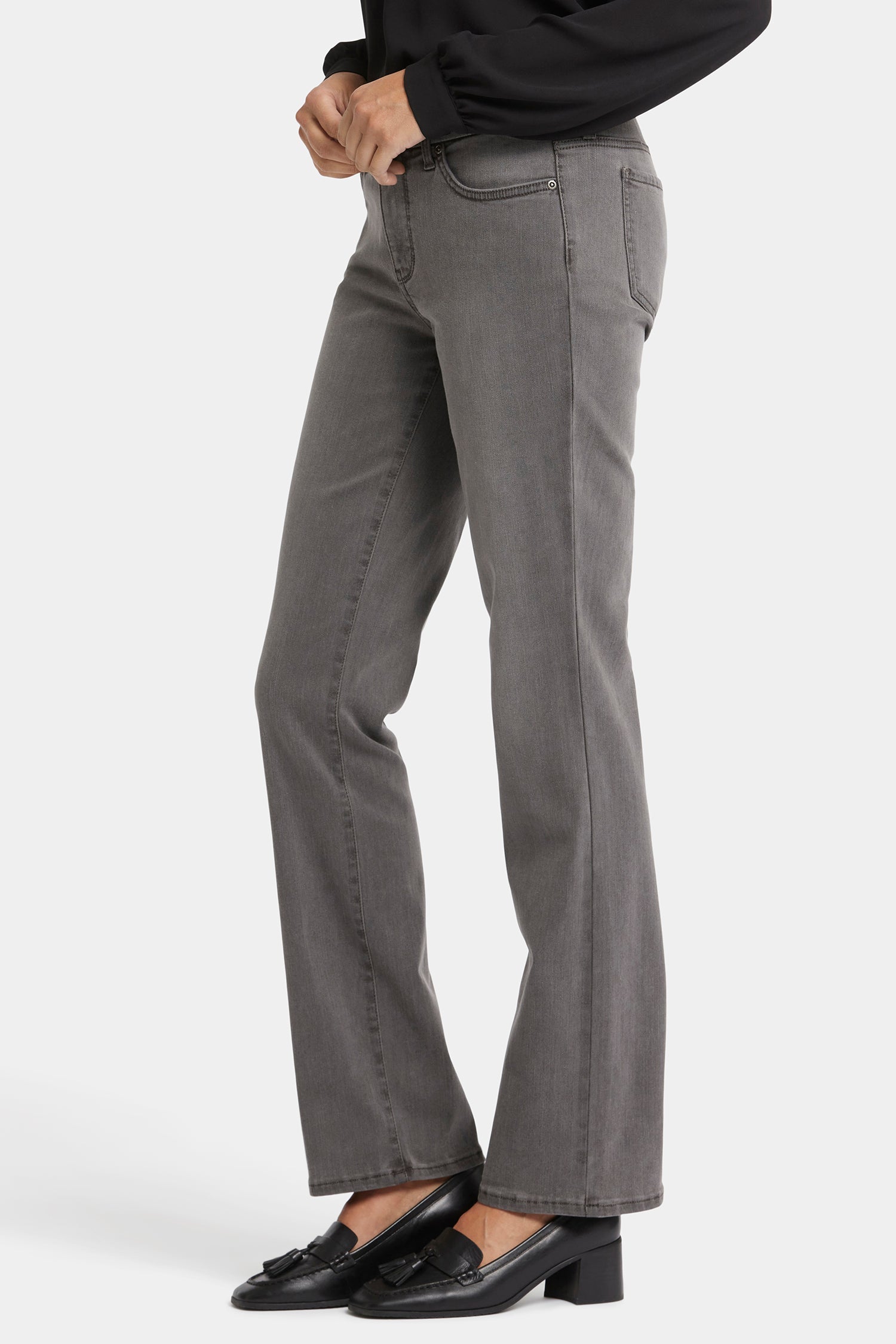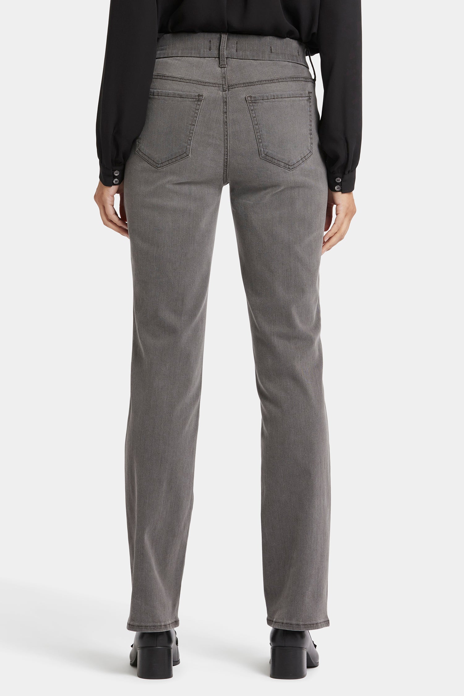 Designed to conform to you, NYDJ's Waist-Match™ Marilyn Straight Jeans have a magical satin elastic that lines the interior of the waistband and molds to your waist for an extra-comfortable fit. The timeless, bestselling silhouette falls straight from knee to hem and pairs well with anything. The design also includes our Lift Tuck® Technology, which uses a proprietary slimming panel to flatten in front and flatter curves in back. Feels like a pull-on jean yet features classic five-pocket styling with a zip fly and button closure. Highlands is a warm medium grey wash with sanding in all the right places for a worn-in look. This jean is made with earth-friendly methods that result in reduced consumption of water, chemicals and/or energy.