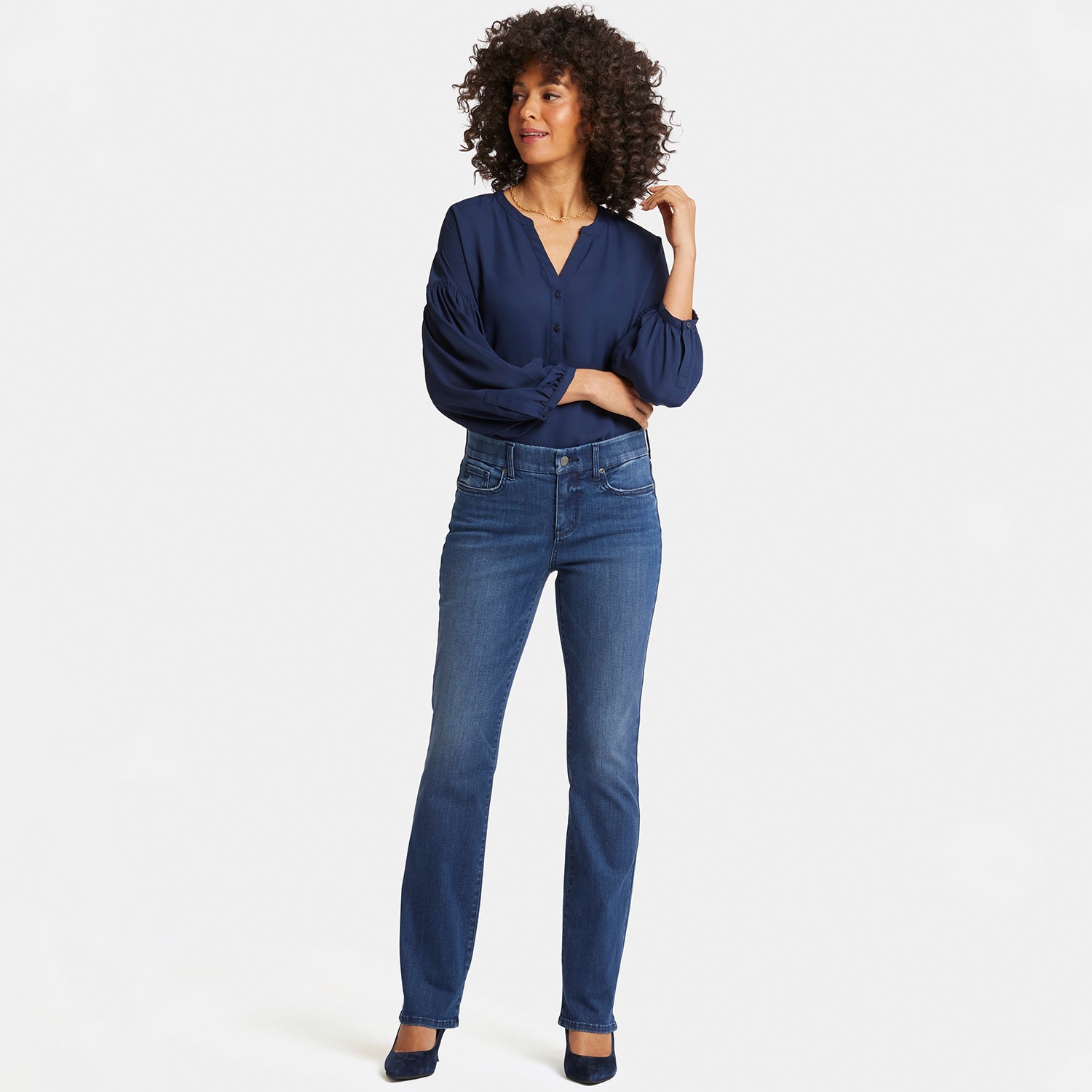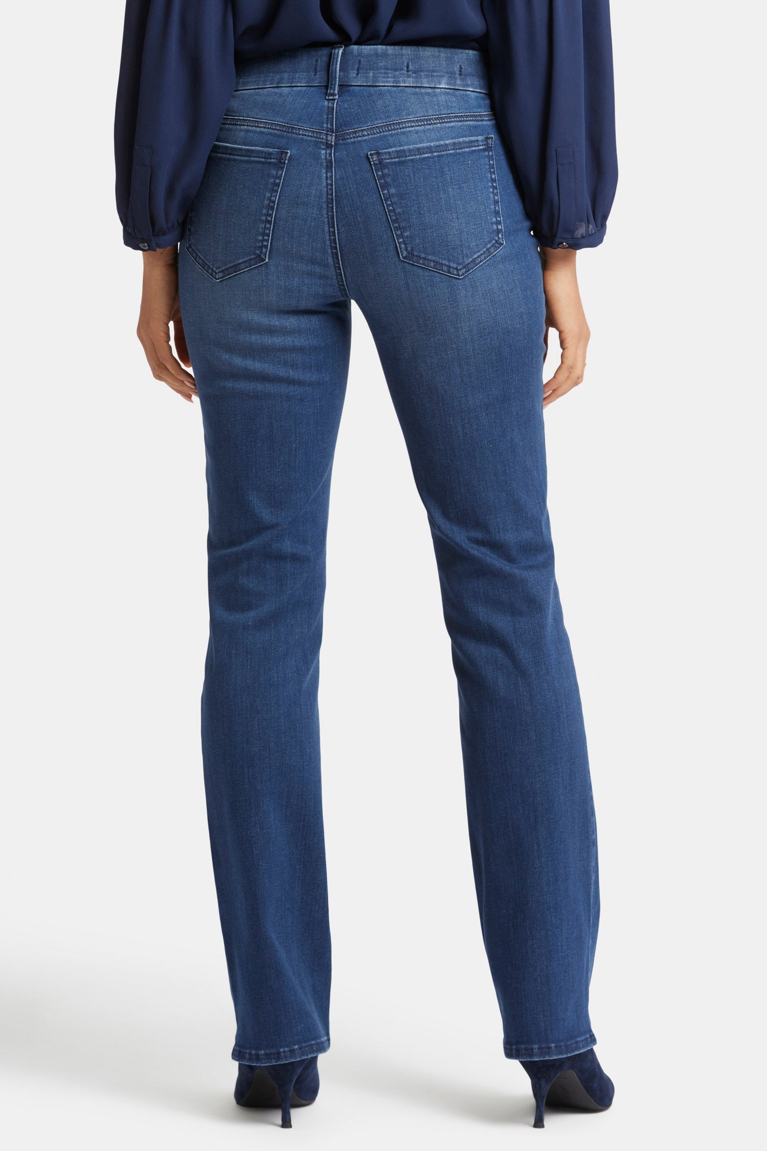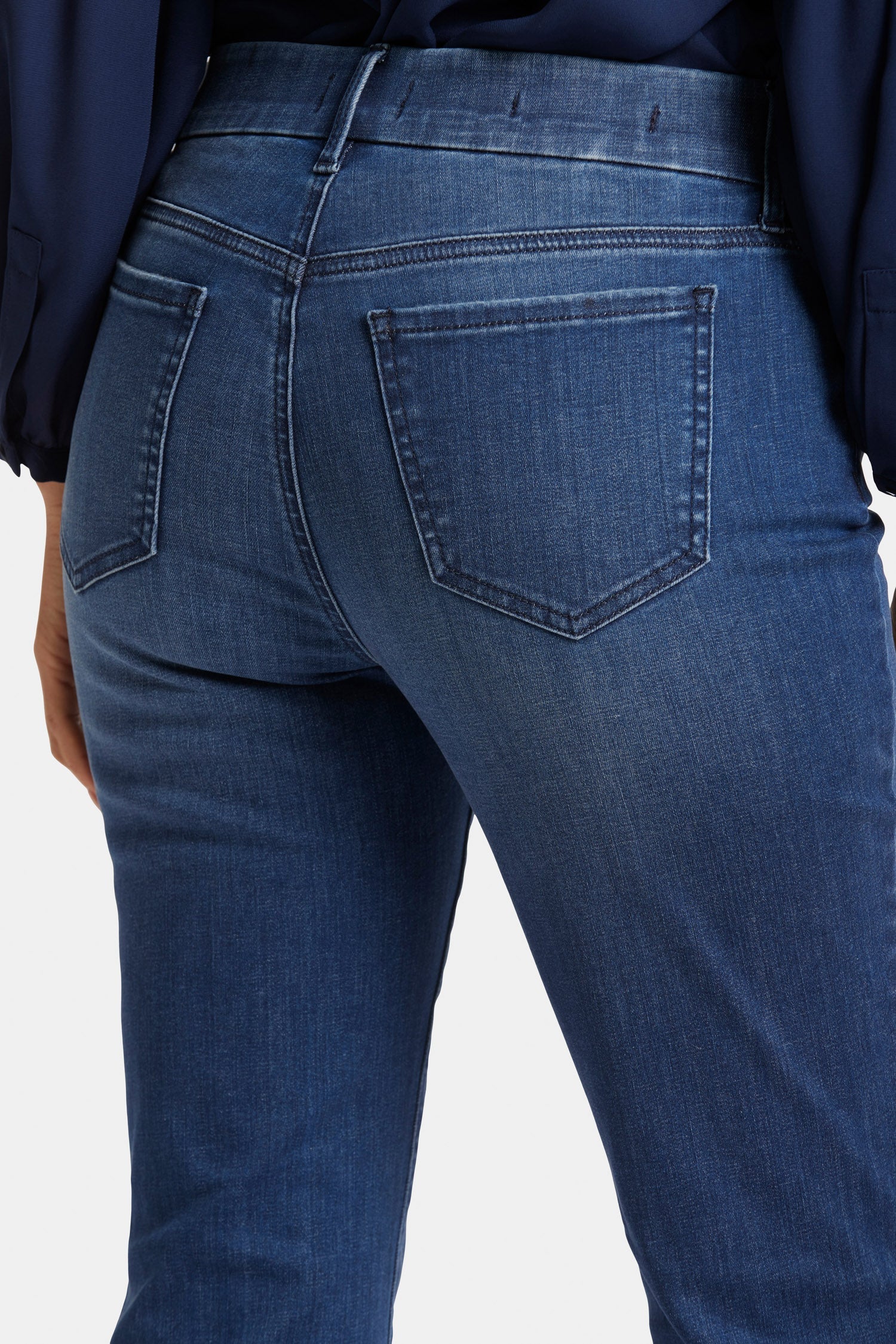 Designed to conform to you, NYDJ's Waist-Match™ Marilyn Straight Jeans have a magical satin elastic that lines the interior of the waistband and molds to your waist for an extra-comfortable fit. The timeless, best-selling silhouette falls straight from knee to hem and pairs well with anything. The design also includes our Lift Tuck® Technology, which uses a proprietary slimming panel to flatten in front and flatter curves in back. Feels like a pull-on jean yet features classic five-pocket styling with a zip fly and button closure. Moonlight is a rich dark indigo wash with pocket distressing, whiskers on the front hips and sanding on the front thighs, knees and seat for an authentic vintage look. This jean is made with earth-friendly methods that result in reduced consumption of water, chemicals and/or energy.